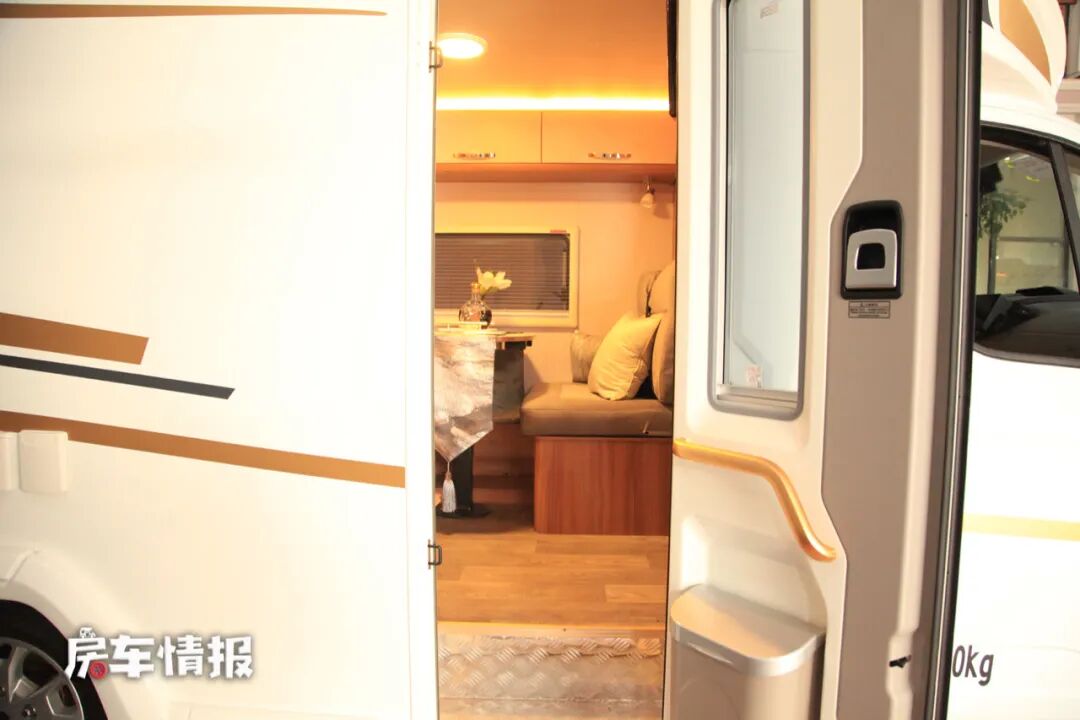 这款房车不仅采用了三明治复合宽体车身结构,还配备了房车专用保温发泡车门,车窗也全部采用的是双层亚克力玻璃,确保车内的保温保暖效果,另外在车身的右侧上方还提供了一个3米的手动遮阳棚,下面还配备了一个大尺寸的行李储存箱。