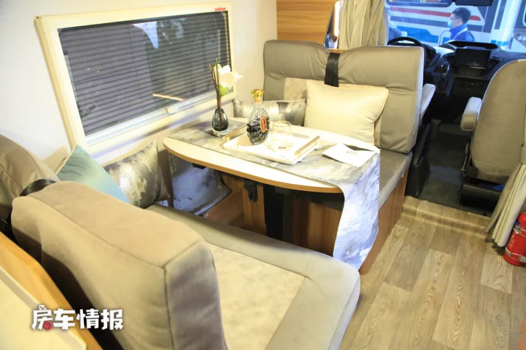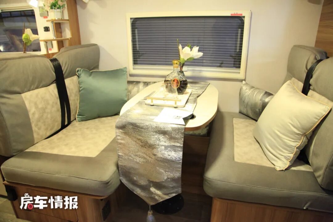 正对乘客门的是会客区,两排对坐沙发采用了同样的布艺软包工艺,中间的升降餐桌采用了大理石的台面,晚上需要休息的时候,可以将沙发和餐桌拼成一张尺寸为1900*1000(mm)的双人床。