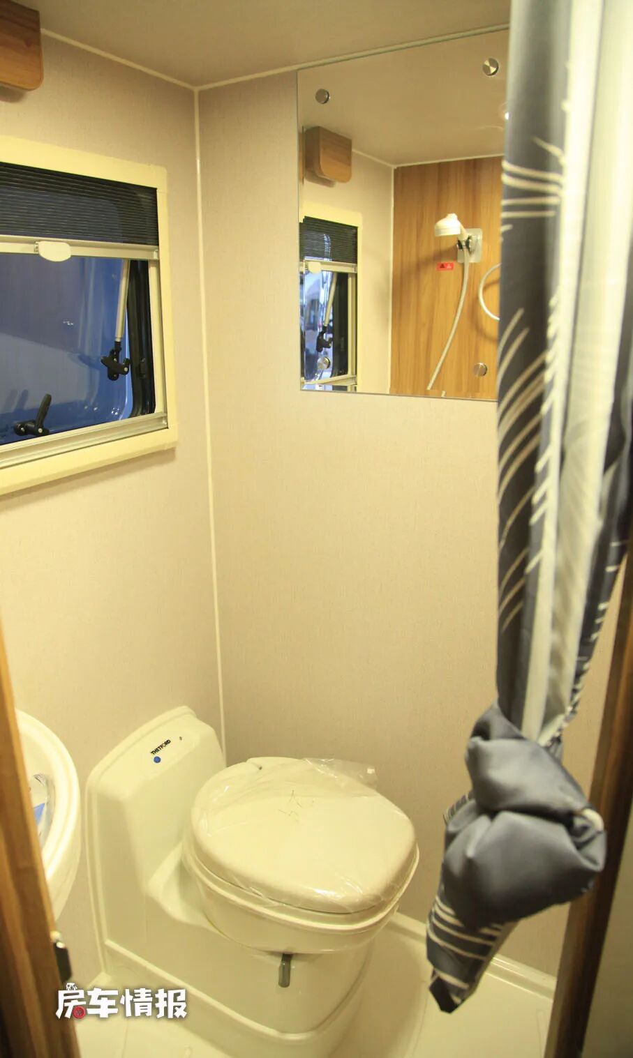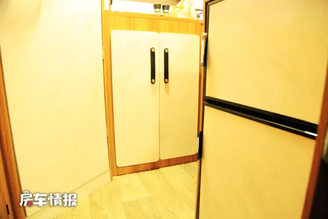 空置的台面下方嵌入了一台上下双开门共85L的车载冰箱,可以实现单独的冷冻冷藏。相比之下,这款房车的厨房区还是非常的宽敞。