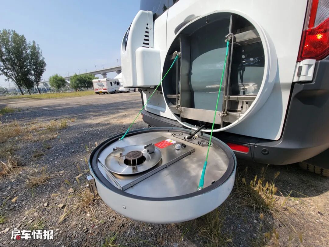 车身外部还是延续了原车的设计,十分的低调,平时上下班代步也很适合,车身外侧配置了房车标配的遮阳棚,尾部则带有空调室外机和一个类似备胎形状的外置厨房,设计的很有创意很新颖。