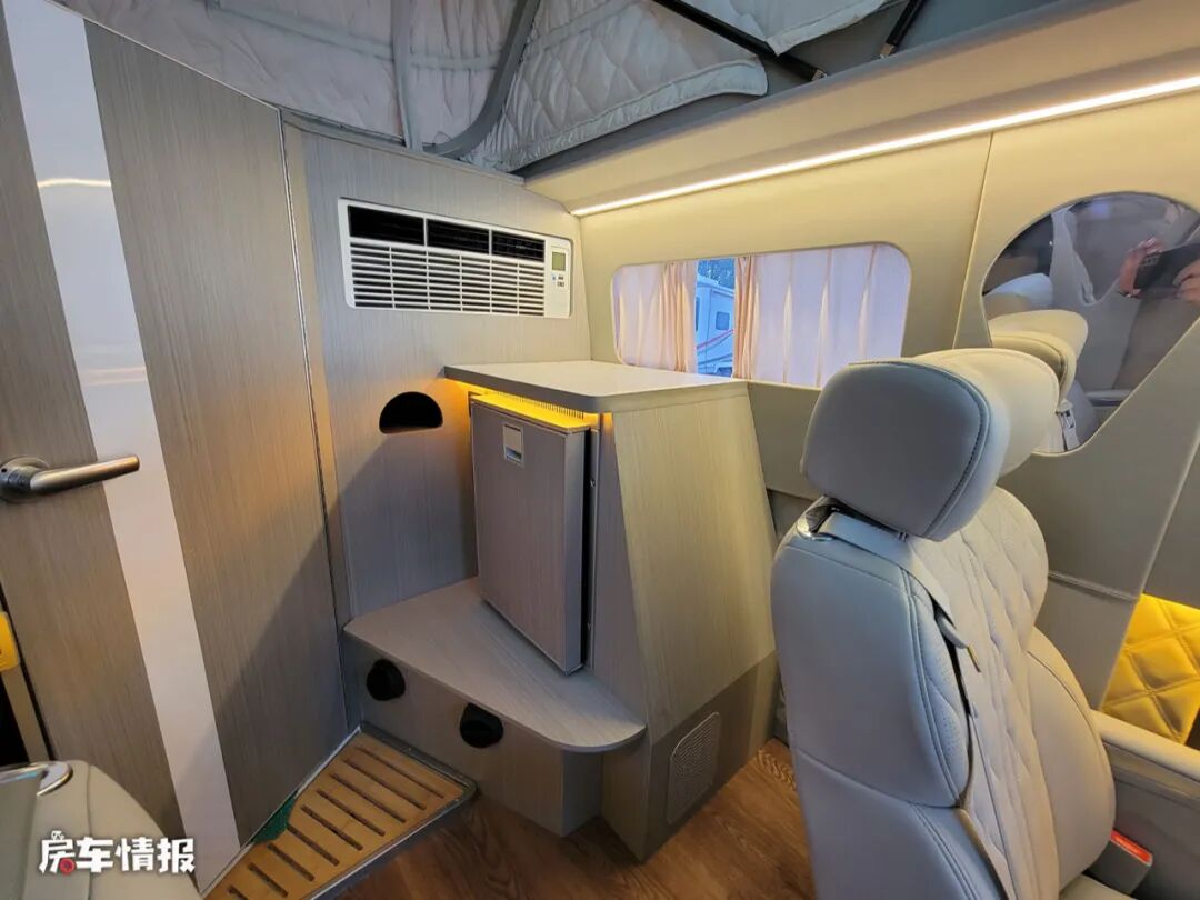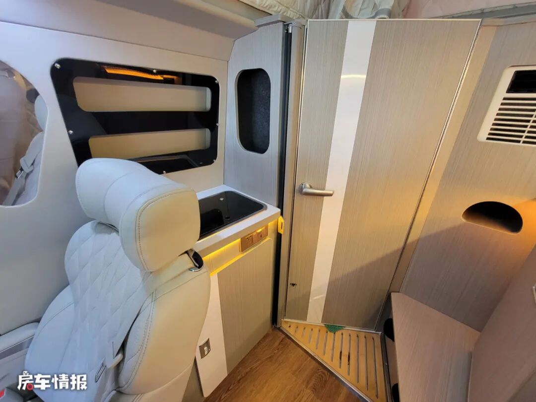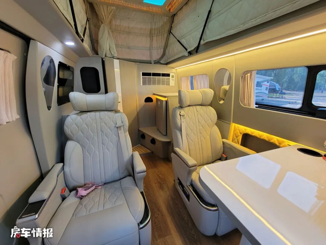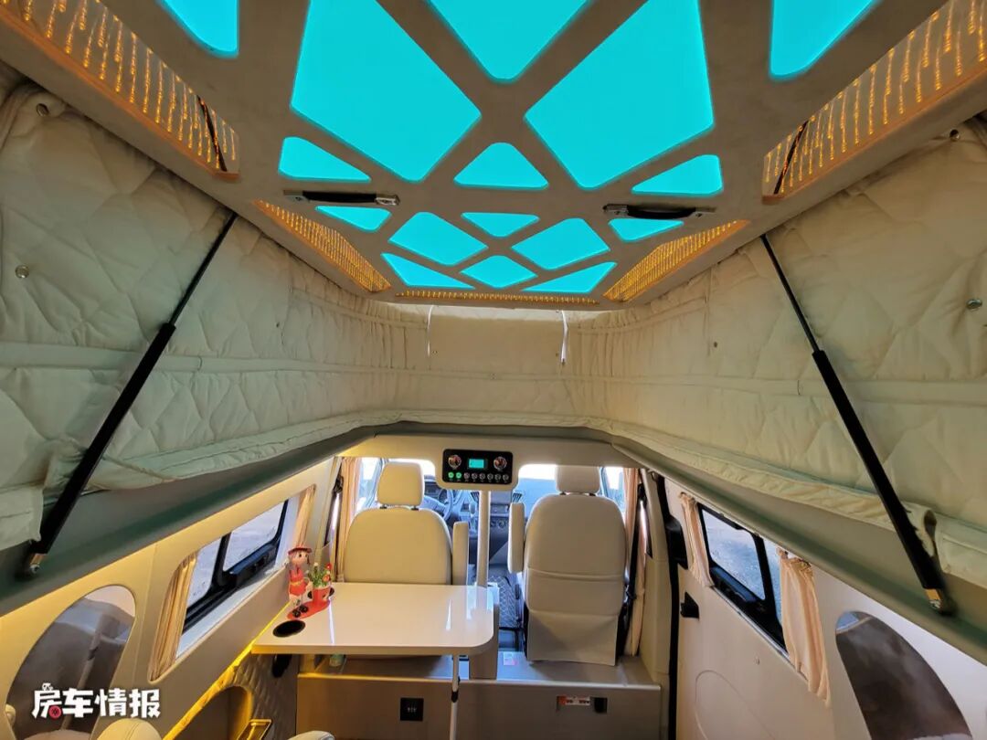 进入车厢内部,和我们平时所见的房车内部设计完全不同,更像是一辆商务车的感觉,尤其是顶部的天花板上还设计了星空屏,增加了浪漫的气息。