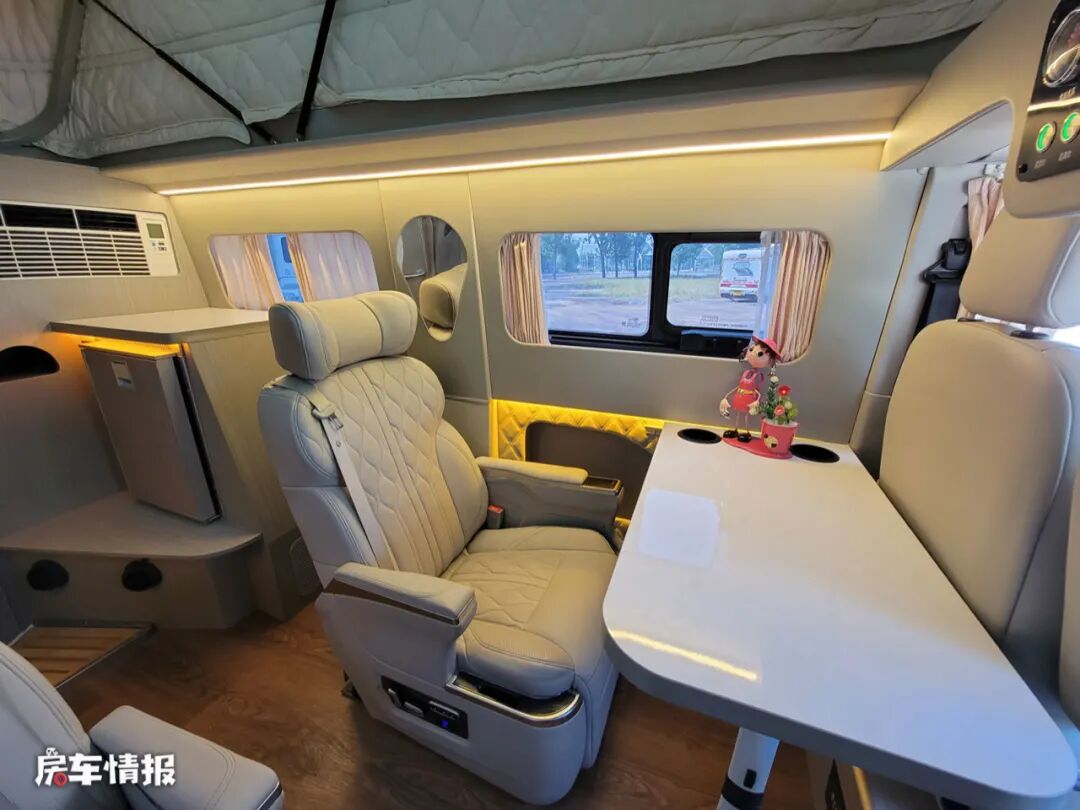 两张豪华的航空座椅代替了平时的双人沙发卡座,并且带有通风换气加热等功能,提升了整车的豪华属性,左侧座椅前方配置了小桌板,也可以解决平时两个人的就餐问题。