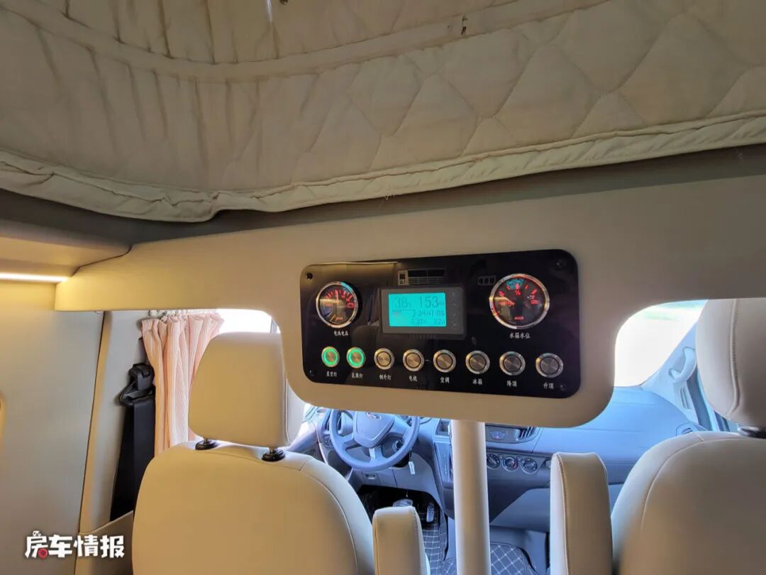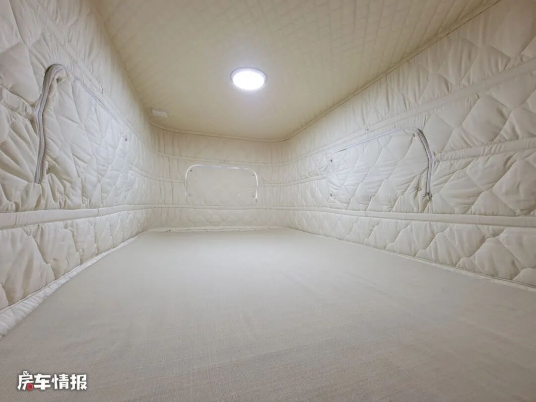 整车的水电控制面板以及升顶机构的控制按键位于驾驶室后方的壁板上,通过按键即可升起顶部,升顶后内部高度可达1.95米,即便身材高大的人也能够直立行走,而刚才我们所说的带有星空屏的天花板实则就是一张可容纳两个人使用的双人床,从车厢尾部的台阶进入上方,保证了隐私性。