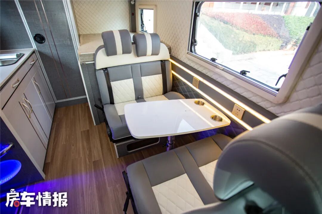 会客区采用四人对卡位沙发,灰+白色的感觉给人比较商务的感觉,墙壁采用软包设计,茶桌安装了置入式杯架,保证行车中的安全。在桌边还有五孔插座,坐在两侧座椅上都可以实现充电,电视则安装在副驾驶座椅的后方。