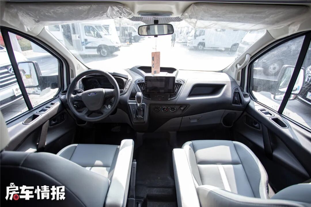 驾驶室内部是福特底盘原装,大屏的导航倒车影像使用起来很方便,看着也不累眼。方向盘采用皮质包覆,即使后期不再加装其他方向盘套,摸着质感也是很好的。