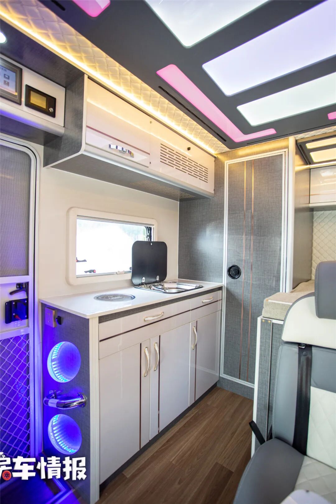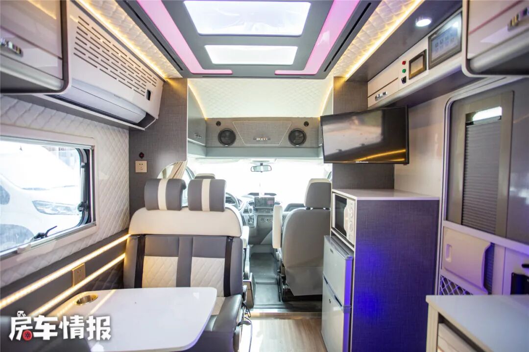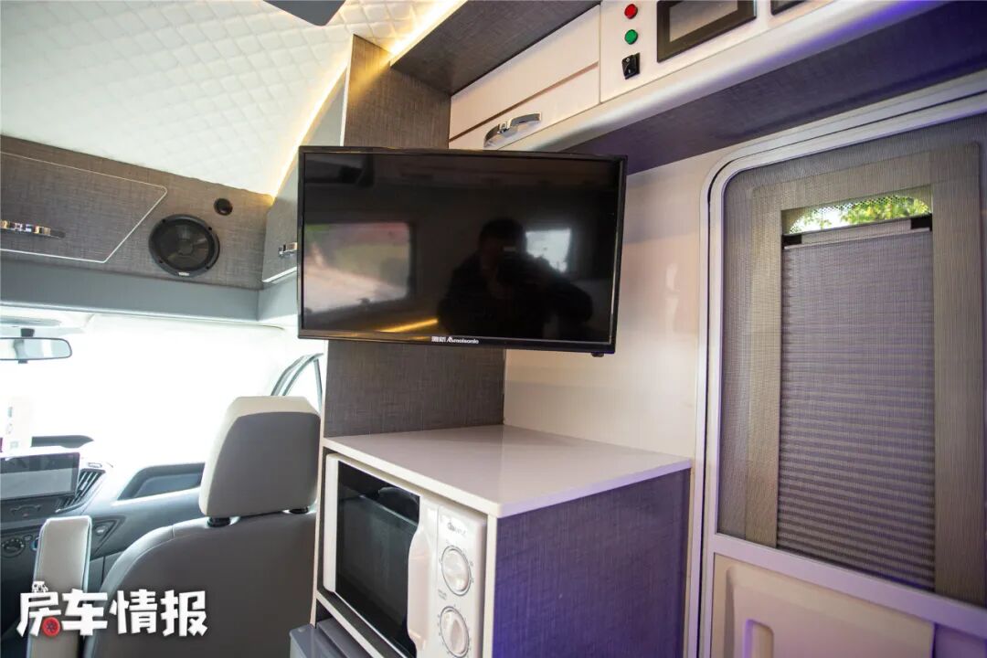 中门上是控制面板,在电路上整车配备有3000瓦逆变器、600安时锂电池和太阳能板,水路上提供了120L净水箱和60升水箱。所以在水电方面是比较出色的,既满足日常使用,又不会过于夸张加大车辆自重。