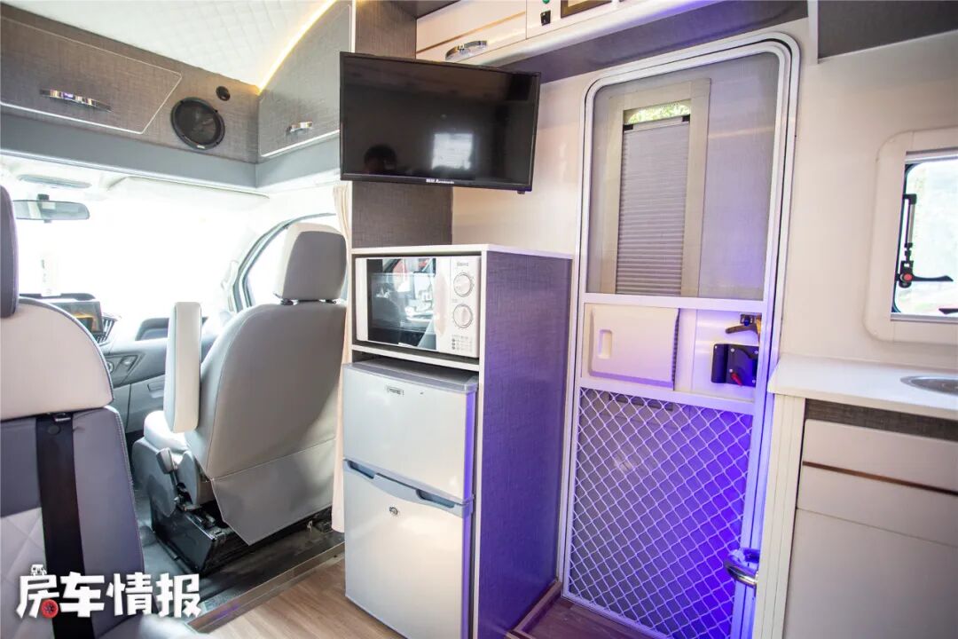 在车辆中门两侧都是厨房区域,一侧是微波炉和房车专用冰箱,微波炉上方还有一块置物平台,可以当作一上车的小吧台来使用。在车门另一侧是电磁炉和洗菜池,下方则是组合储物柜,在操作台上方还有行车空调出风口。