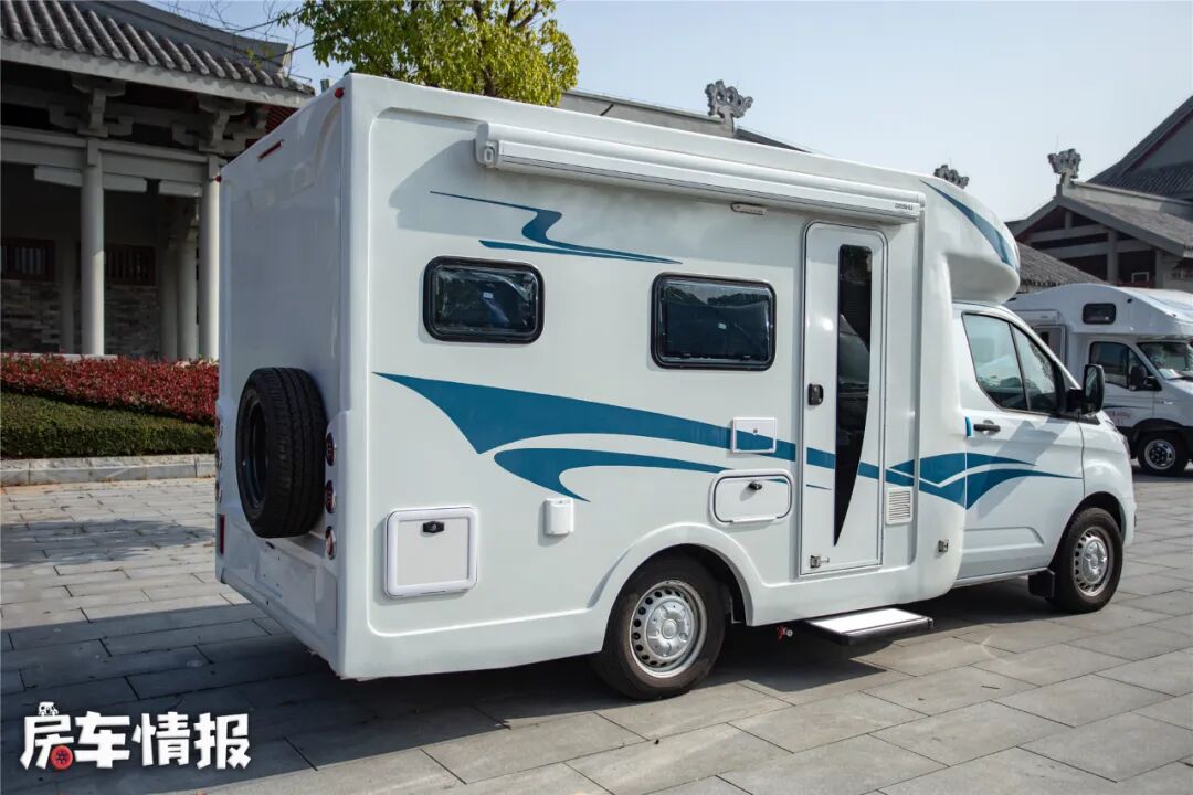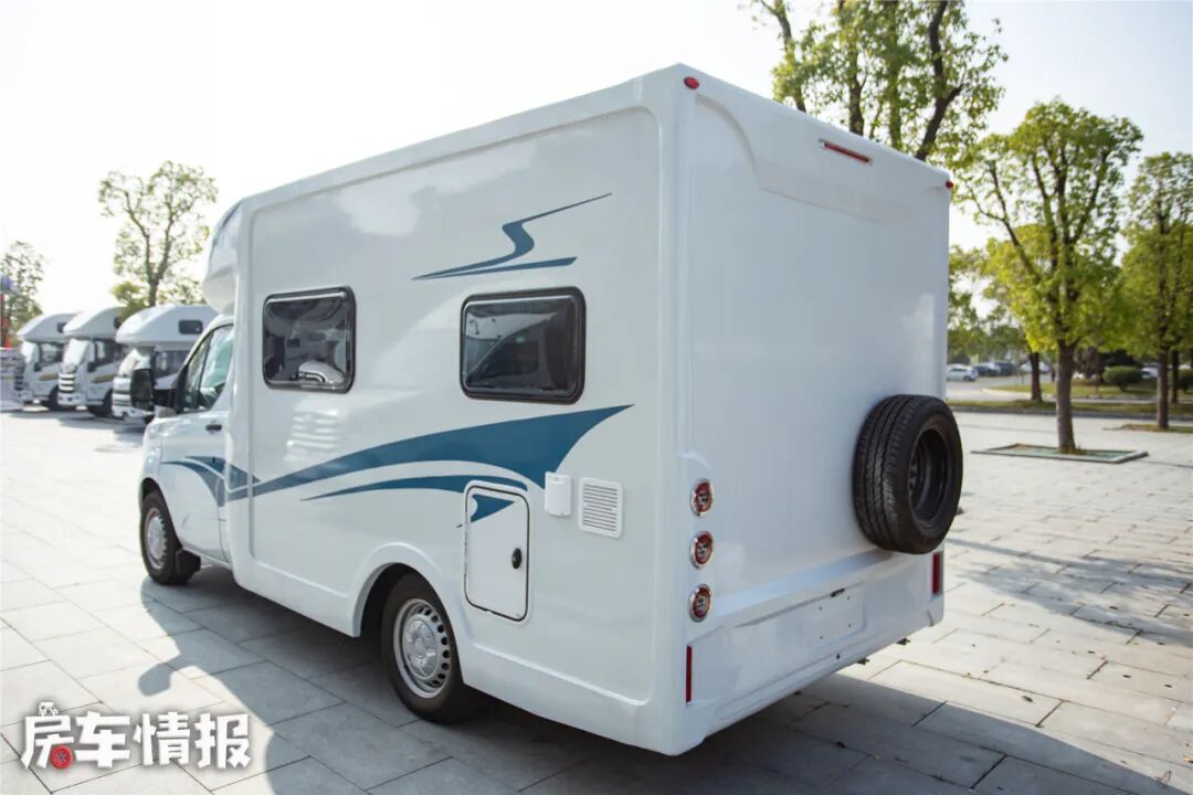 在车尾还有一个备胎,所以车辆看起来更加具有越野感。四路影像以及倒车雷达、倒车影像又保障了旅居中的安全。