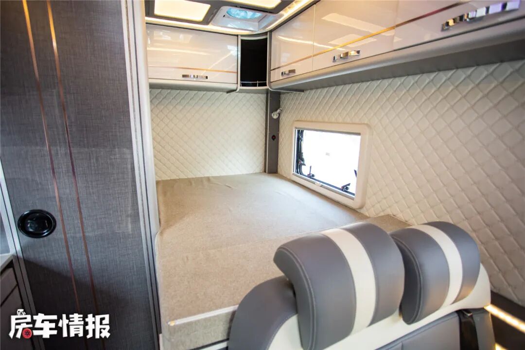 车尾部的床是纵置设计,常规状态下尺寸不大,再需要休息的时候需要将前方卡座座椅靠背向前翻折,如此就能变成一张长度达到1米9的床铺,在顶部有储物格和吊柜,放置行李的位置还是很充足的。