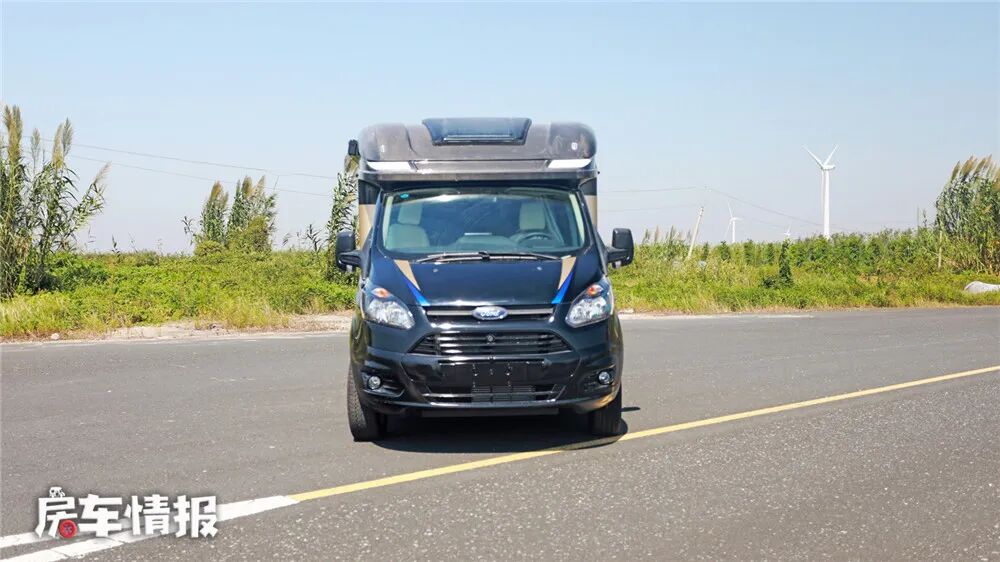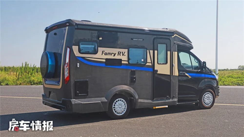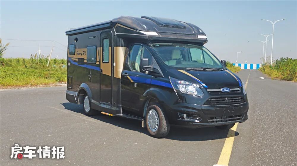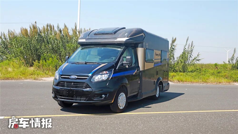 这是一款典型的T型房车,是有法美瑞基于福特新全顺底盘改装的,黑色的车身材质看上去更加沉稳大气。整车尺寸长宽高分别为5995mm×2255mm×2800mm,整车荷载4-6人,满足蓝牌C照的驾驶需求。