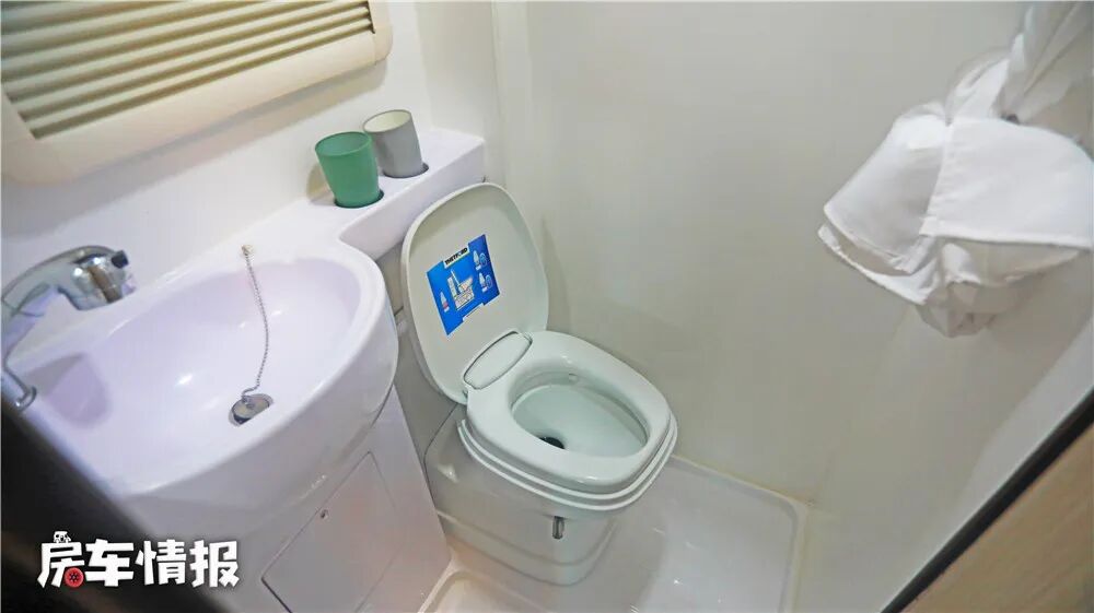 卫生间的空间能满足一个成年人的洗漱。但配置方面还是比较齐全的,主要有房车专用马桶、洗脸盆、抽拉式水龙头、淋浴花洒、梳妆镜、淋浴帘、毛巾架和储物格灯相关配置。