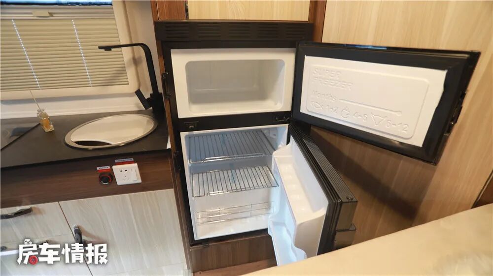 旁边的的小吧台可以放置鞋子,整车的储物空间还是比较充足的。在厨房区域的后方配置了一台118L的双开门冰箱,分为冷冻和冷藏区,可以放置一些瓜果蔬菜和水饺冷冻。