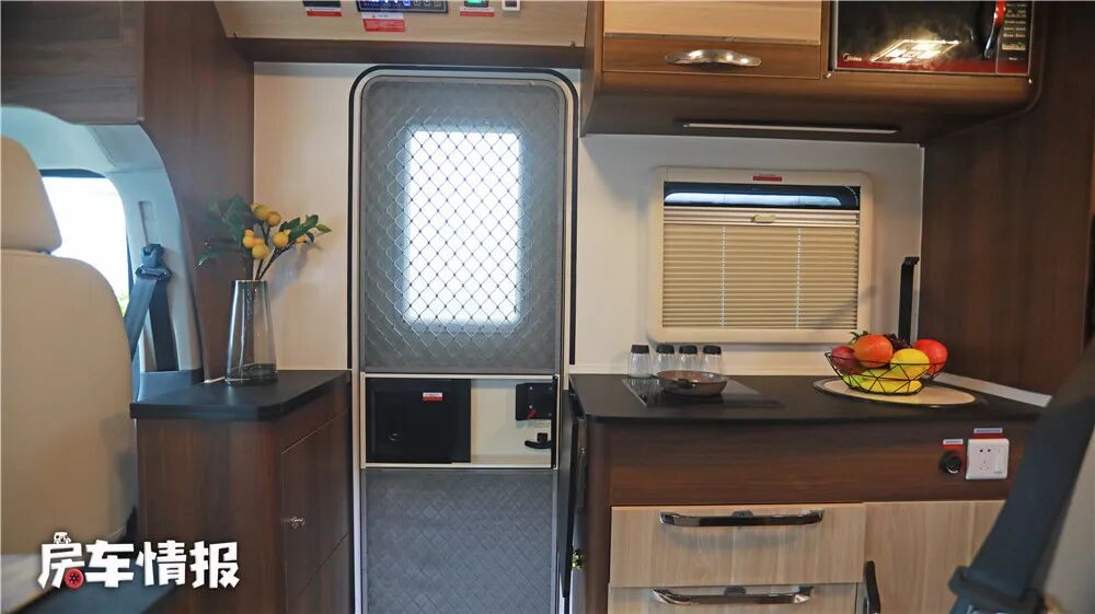 会客厅的对面则是厨房区域,操作空间不错,配置方面主要有电磁炉、凹型水槽、微波炉、抽拉柜的常规性配置。旁边的乘客门采用双层设计,这在夏季的时候可以更好的防止蚊虫进入。