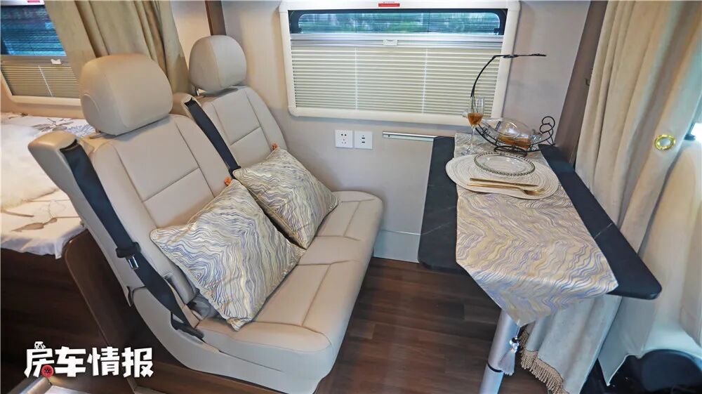 会客厅采用单排双人座椅,同时配有三点式安全带,前方是一张可移动、可拆卸、可升降的餐桌,为乘客提供了一个办公、就餐的场所。旁边是一张尺寸适中的矩形外推窗,方便为会客厅提供通风和透光,同时配有防蚊和遮阳的功能。顶部则设计了三个储物吊柜,可以放置一些方便拿取的物品。