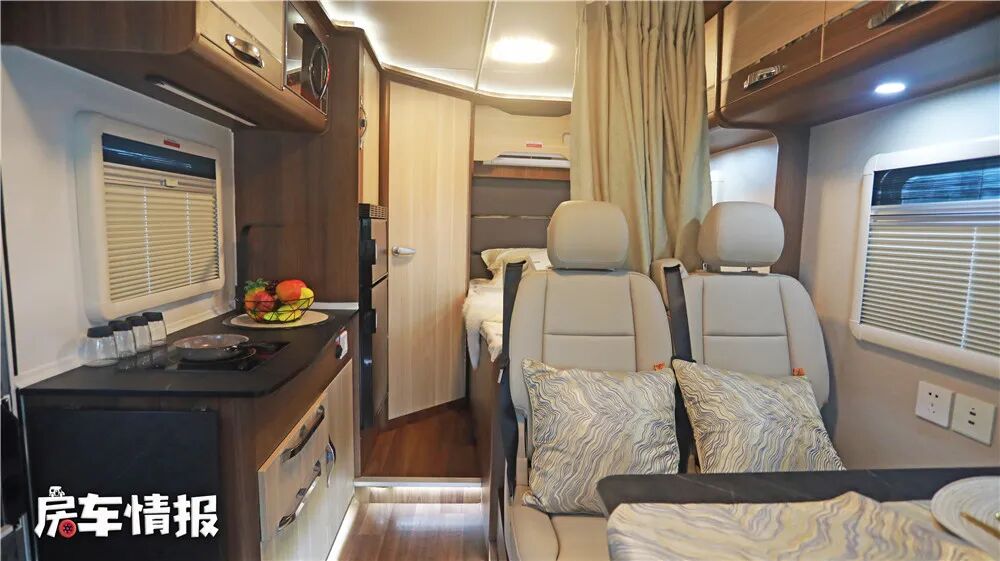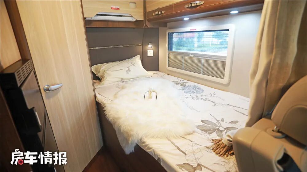 来到车内,给我的感觉温馨舒适。驾驶舱与生活区采用了隐私帘的设计进行隔开,可以为车友提供一个较好的隐私空间。布局方面采用单排双人座椅加纵置床铺的设计,虽然空间显得拥挤,但各项功能区域的划分还是较为明显的。车内的板材均采用E0级环保家具,能够为车友提供一个较好的生活空间。