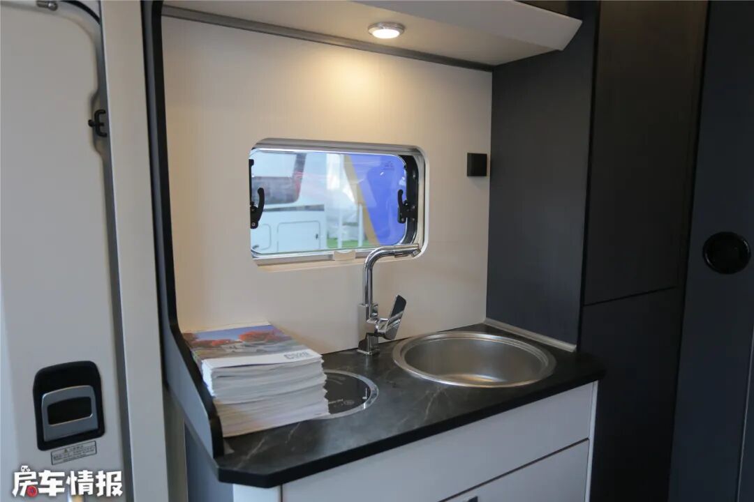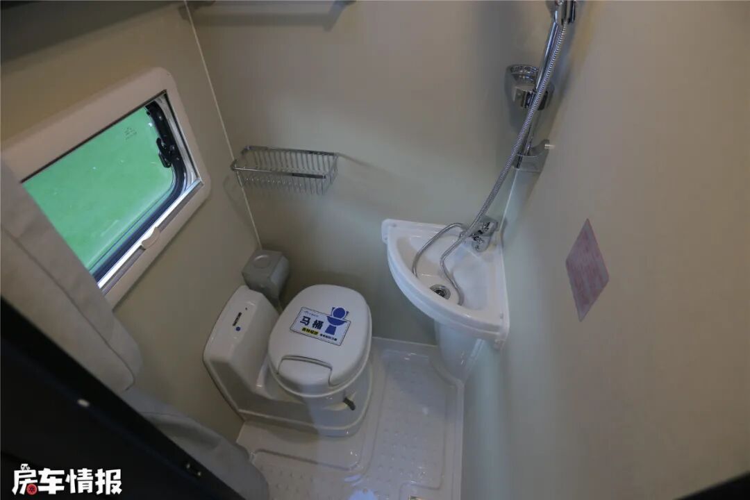车尾是卫生间区域,内部配有赛特福德集便式马桶、洗手池、独立淋浴头、带排风扇的顶窗、侧窗、浴室柜等卫浴设施,功能完善。