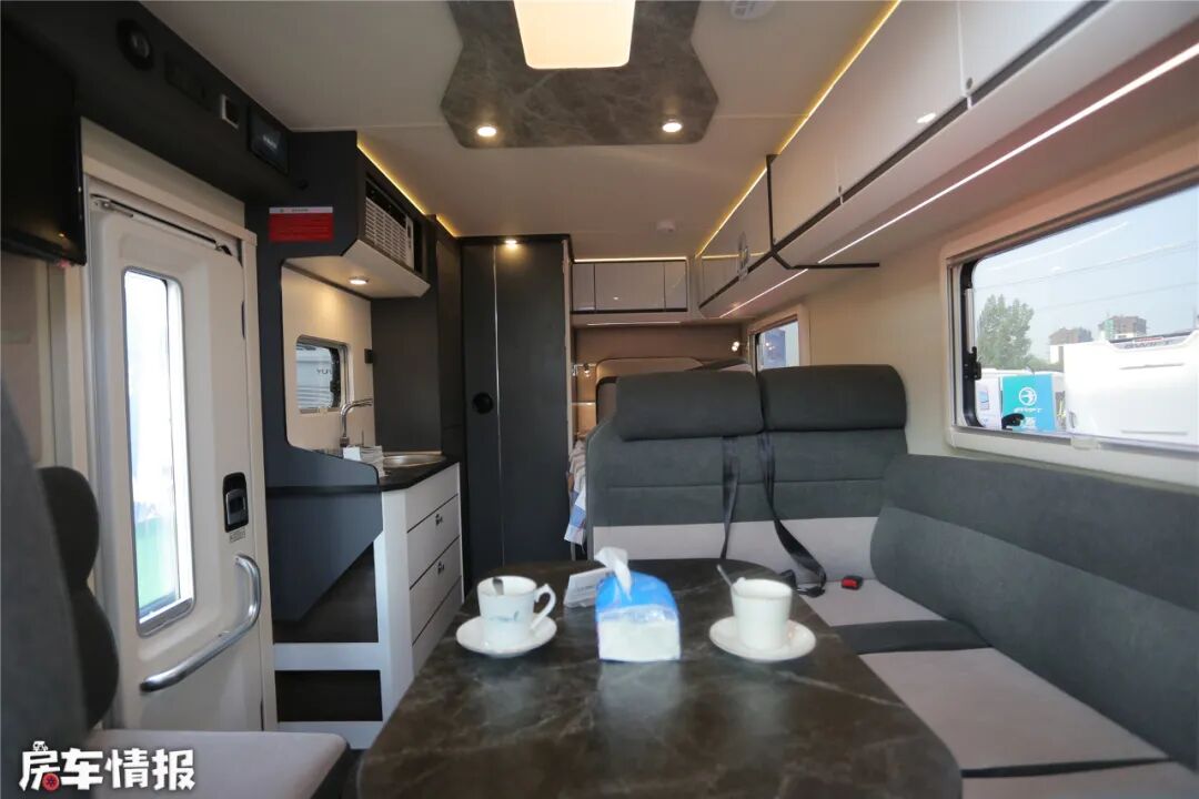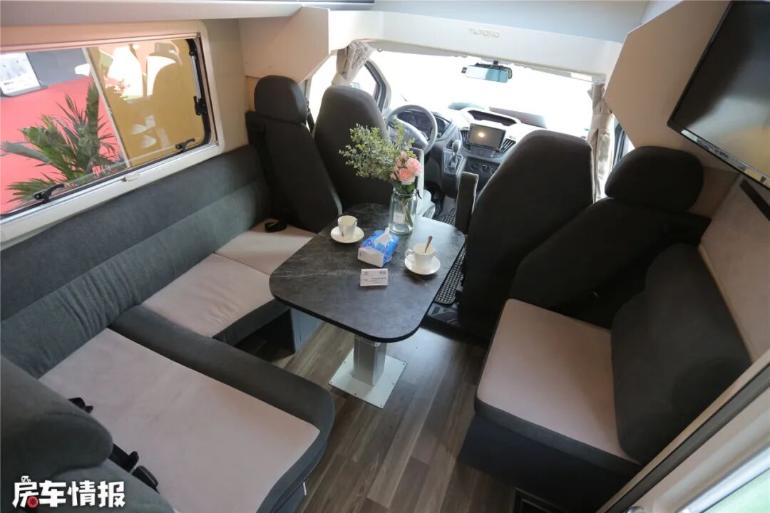 中间的会客区是一个L型沙发,并带有安全带,可以供行车时乘坐。对面配备了一个单人卡座,中间的升降餐桌可以在拼床时降低,最终形成环形卡座拼床,提供较为舒适的坐卧体验。