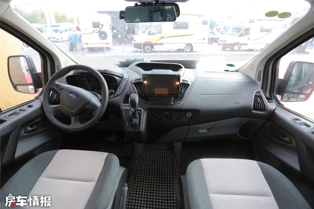 动力上,基于福特底盘采用2.0T汽油发动机+6AT自动档变速箱,满足国六排放标准。驾驶采用多功能方向盘,配有前后盘式制动、ABS+ESP、主副驾驶安全气囊、倒导监一体机,便于操控。驾驶舱顶部是小额头设计,上方提供了环形的置物架,可以增加了额外的储物空间,车顶还提供了外推窗,照顾采光的同时,还能通风透气。