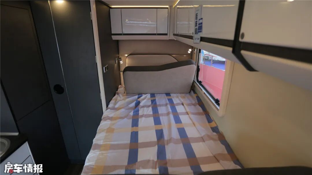 休息区位于车尾,提供了一个固定的双人床,底座是储物空间,可以放置许多大件行李。床头采用软包处理,还带有顶柜和小夜灯等配置,非常方便。