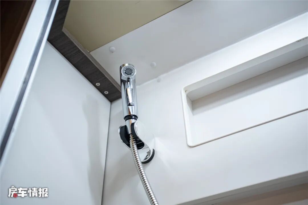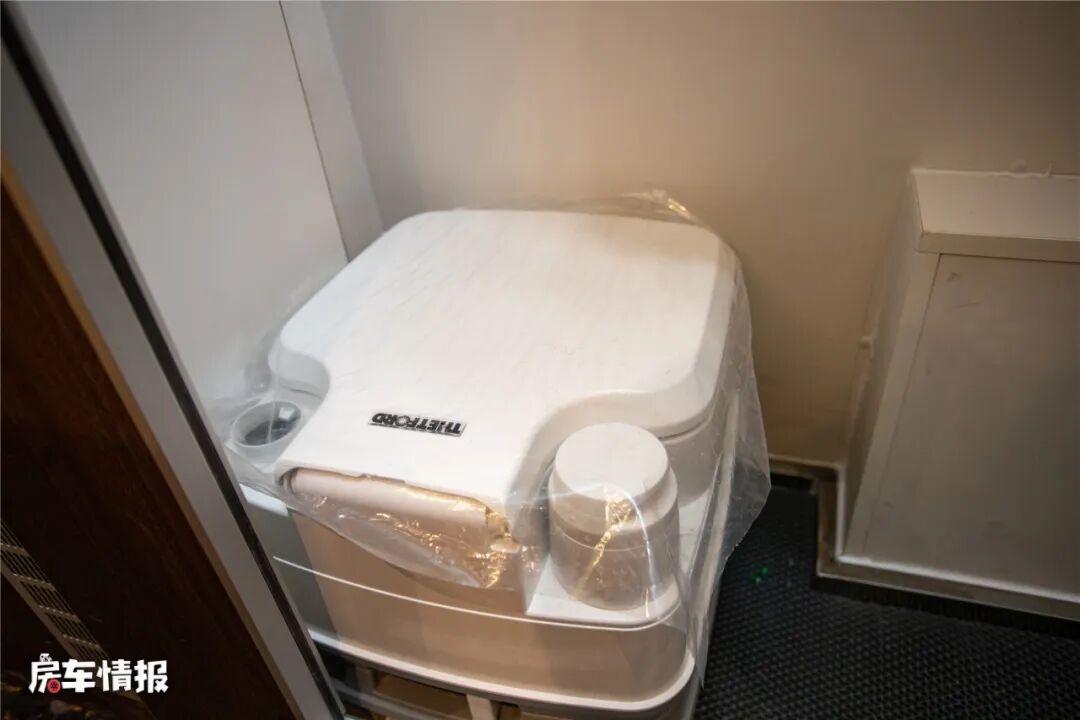 这台车配备独立抽拉伸缩卫生间 ,更加节省空间,使用时,将卫生间隔断拉出,扩大卫生间的面积,配备有赛特福德便携马桶,折叠洗脸盆,淋浴花洒,双向换气扇等。