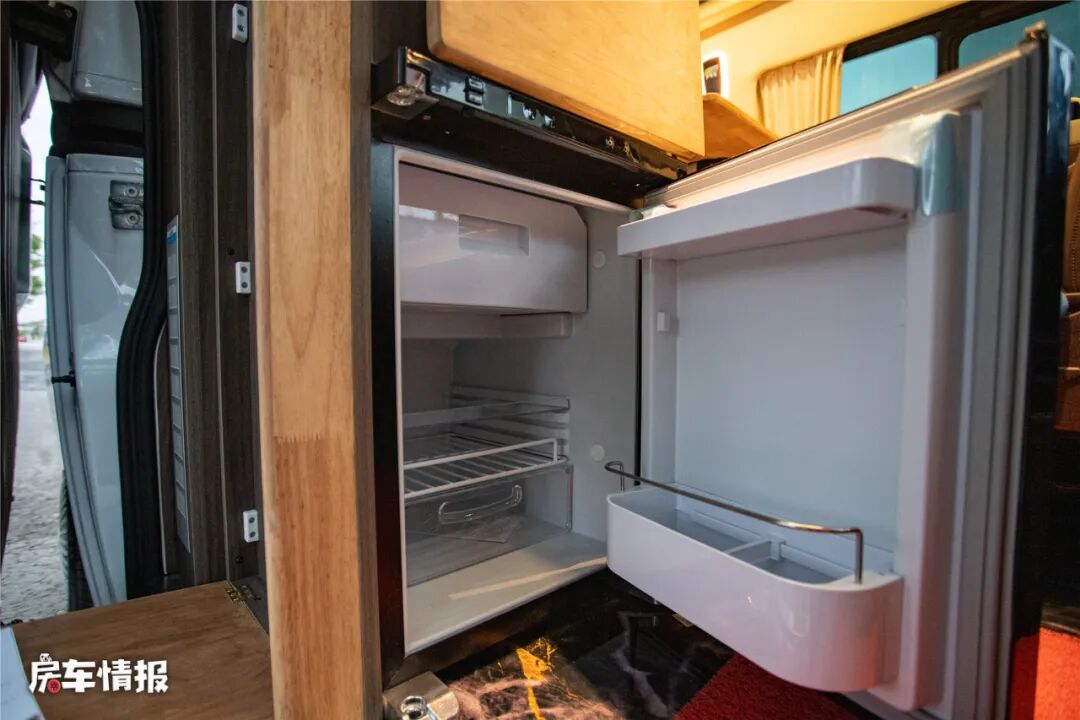 打开中门的位置就是厨房区域了,外侧有一个折叠桌板,直接就可以支在外面,桌面面积比较大,方便我们摆放各种美食,来到车内,厨房台面还有一个折叠小桌板,拓展台面操作空间,小桌板下方,有一个比较有意思的50L冰箱,上方冷冻下方冷藏,最特别的就是这个冰箱,左右两侧都可以打开,还可以轻松把冰箱门整个拿下来,冰箱的位置就在门口,这样我们无论是车内车外打开冰箱都很方便,是不是很特别。另外厨房区域还配有带有盖板的洗菜池和翻折水龙头。