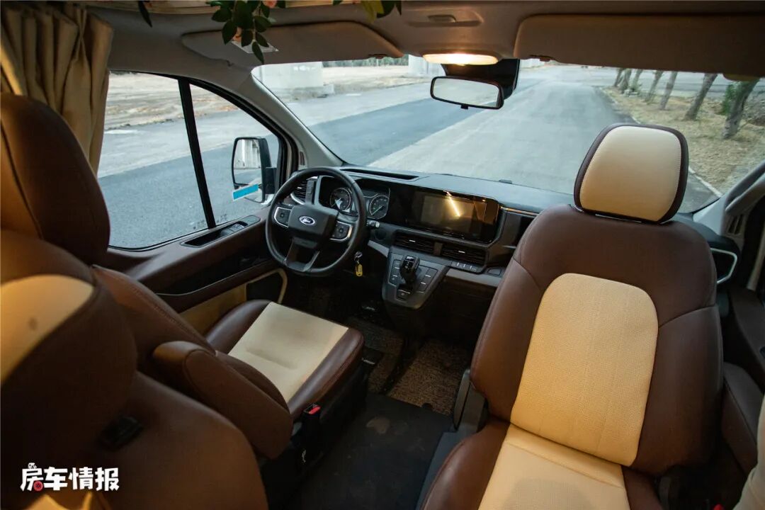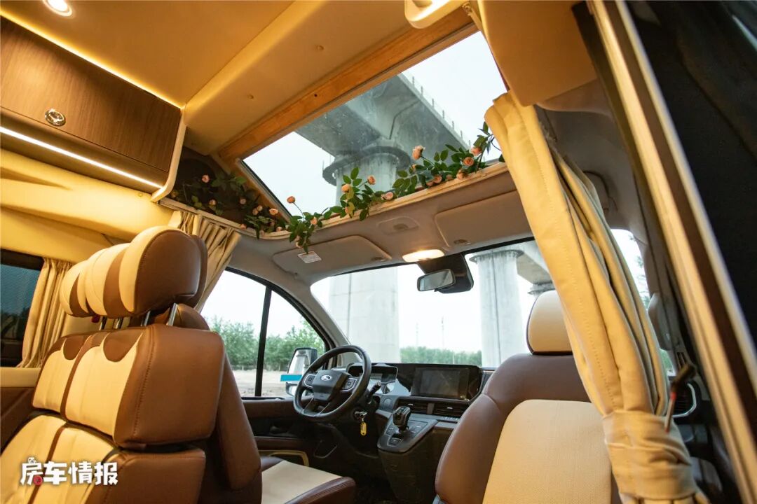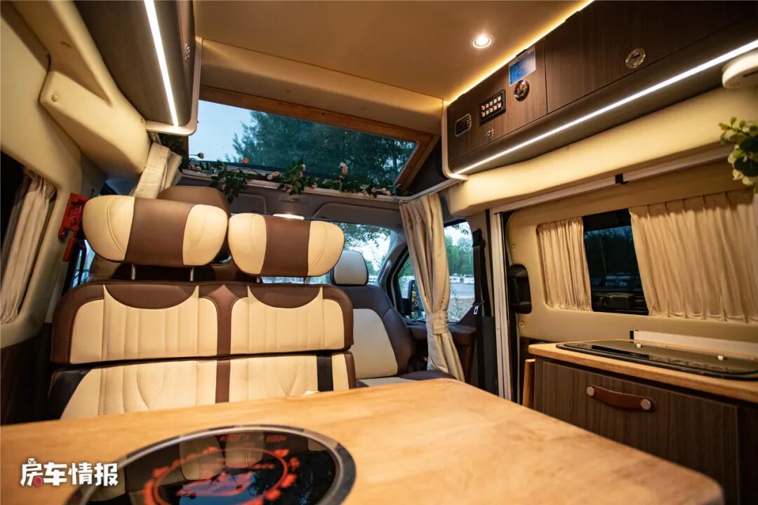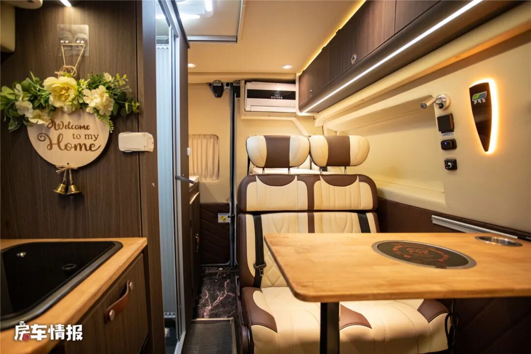 来到车辆内部,整车可以睡三个人,内饰颜色以咖色和米色为主,十分温馨,内部高度1.75米。