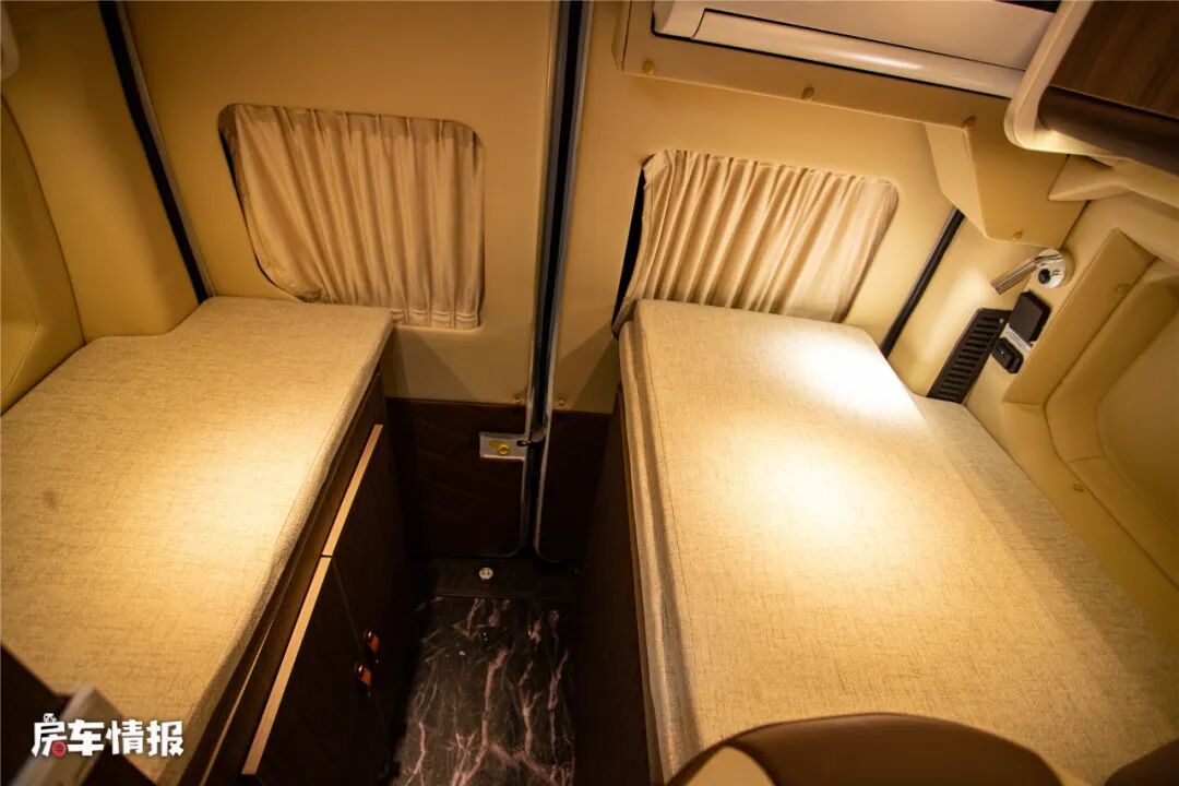 现在我们在将床垫拼接起来,形成后横床,尺寸是1.85米乘1.15米的双人床,快和自己心爱的人相拥而眠吧!后横床的上方还给大家配了一台,12v房车专用变频空调。车辆还配备柴油暖风机,让我们车内更加温暖。
