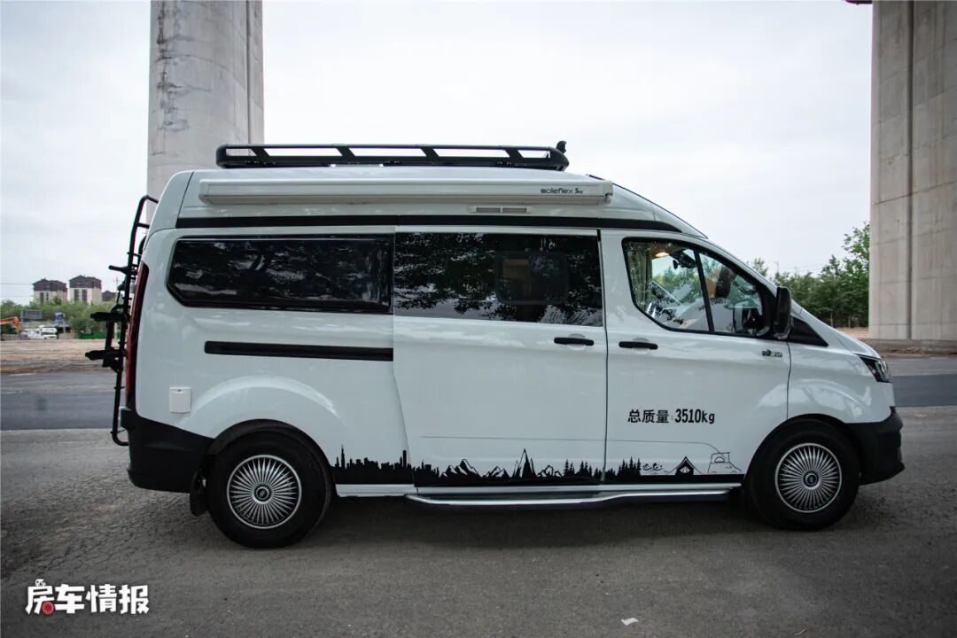 车身尺寸,长度5.341米,宽度1.986米,高度2.630米,这是加了车顶行李架的高度的,原车的高度2.390米,不足3米的高度,还是通过率比较高的。在房车当中B型房车的操控也是很不错的,像我们女生开起来也会更容易一些。这台车总质量是3.51吨。