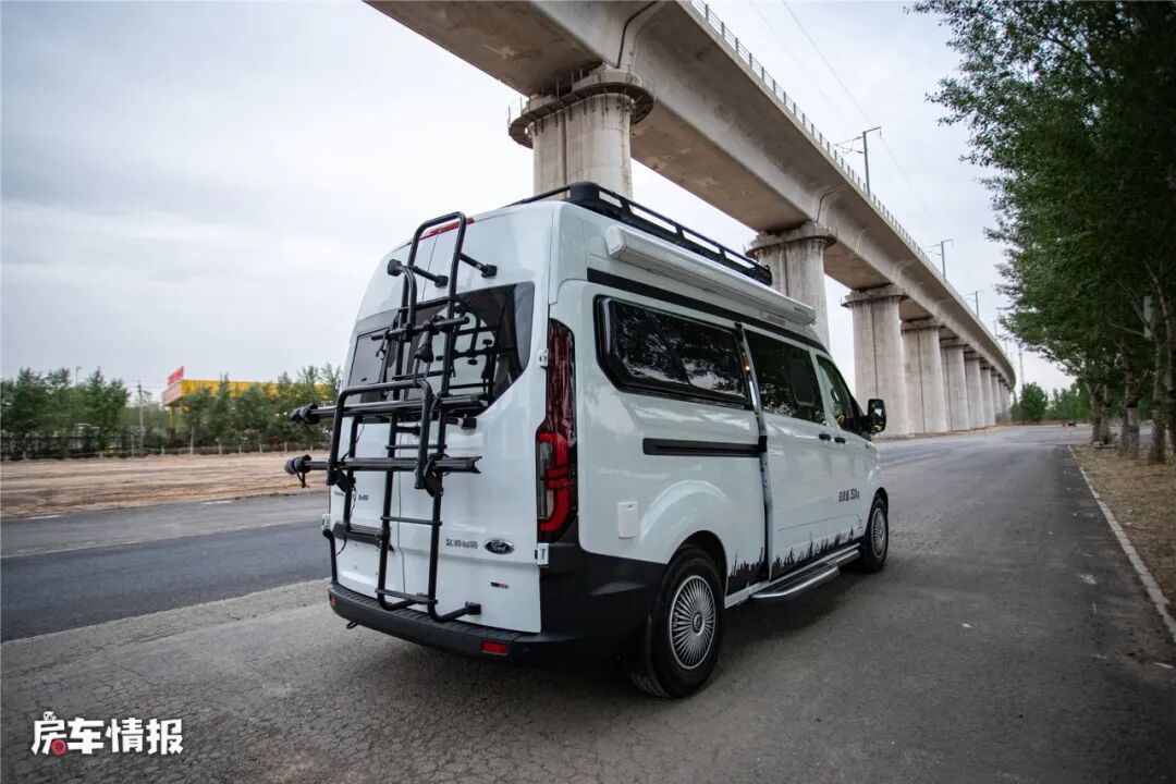 车头前方我们可以看到一个长条型的越野探照灯,在你夜晚越野探险时,可以帮你照亮前路。车身外部配有2.5米遮阳棚,车身尾部双开门,打开之后,可以给整辆车内部通风换气。尾部车门上还配有自行车架,车顶爬梯,既可以上车顶存放行李,又可以爬到车顶欣赏夜空美景。尾灯也做了升级,成为了LED大灯,还做了熏黑外罩,看起来更加的时尚运动了。