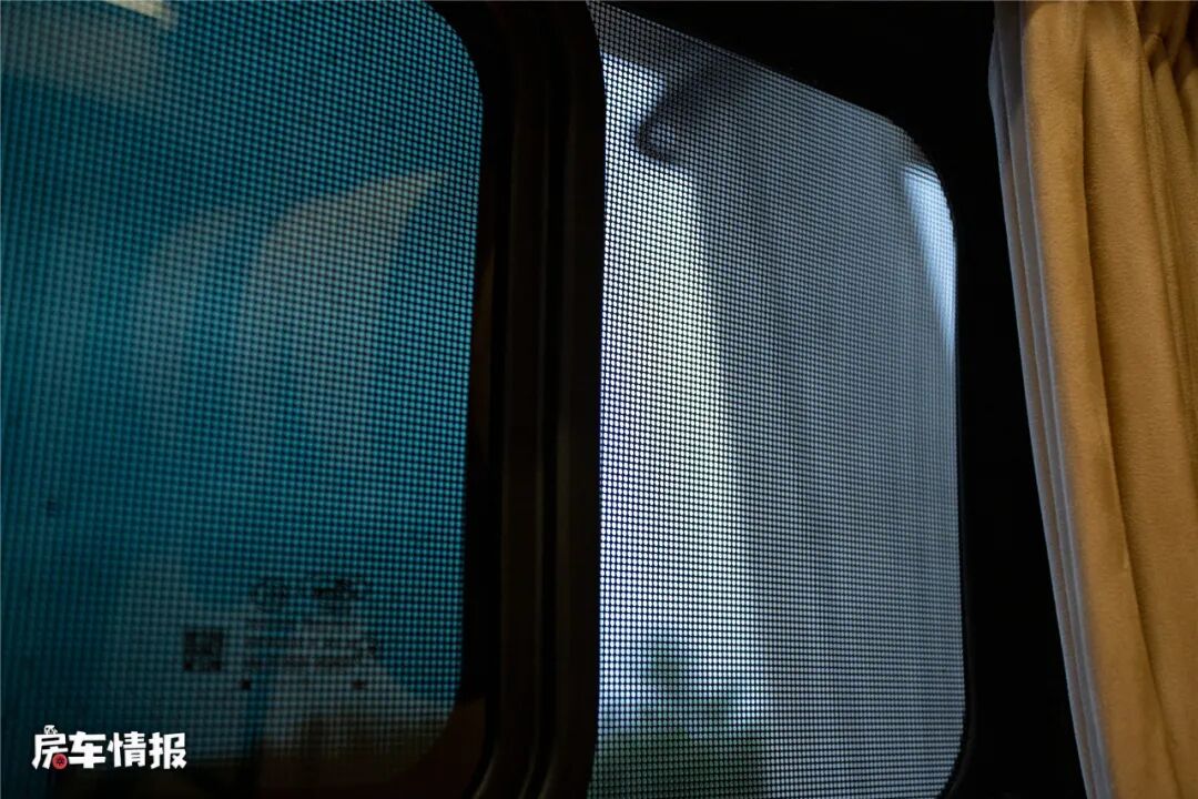 客厅区域,双向对坐卡坐沙发,四个座椅四个安全带,所以整车核载6人,可睡下三个人,客厅的餐桌上配有一个小型电磁炉,将餐桌降下可拼成一张1.85米乘85厘米的单人床。车窗方面采用侧拉窗,行车的时候也可以开窗进行通风,而且还给大家配备了金刚网纱窗,夏天防蚊虫再好不过了。