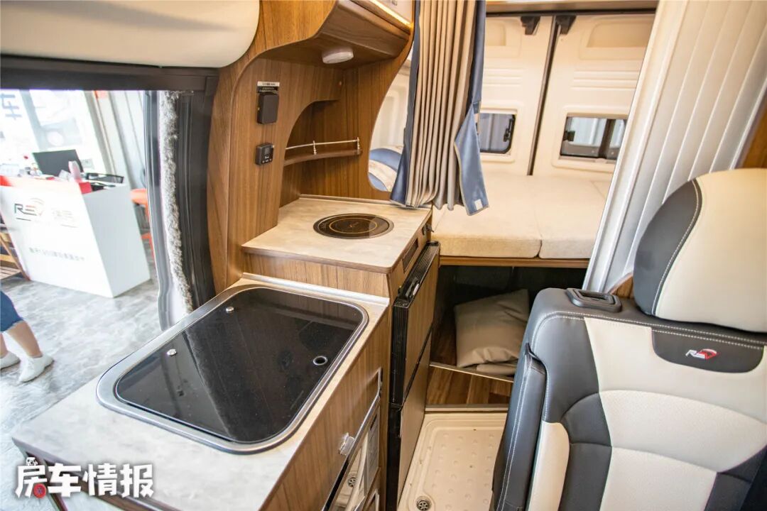 位于车厢侧滑门旁是车内的厨房区域,这里提供了电磁炉、洗菜池、微波炉、以及一台房车专用冰箱,位于厨房外侧还有一个可拓展的小桌板,用来提升厨房操作台面积。