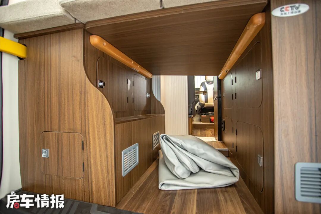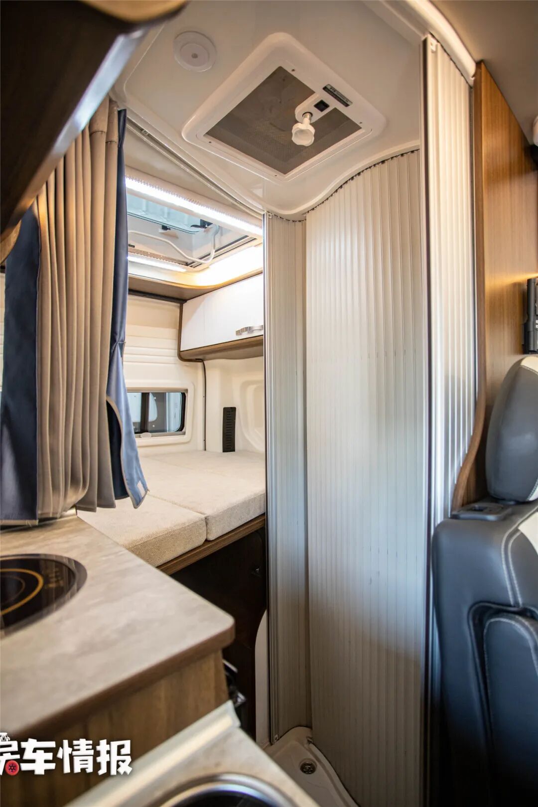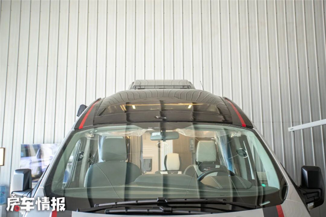 另外还有一点值得注意,那就是在驾驶室顶部,这款车并不是传统的封闭式车顶,而是采用了一块黑色天幕玻璃,虽然不能开启,但也在很大程度上提升了车内的通透性,这点在同类型房车上还是挺少见的。