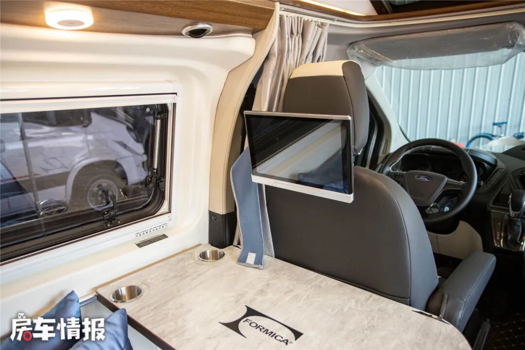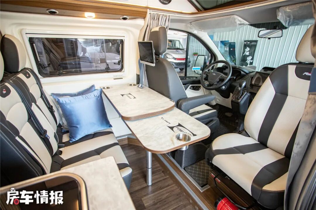 进入车厢内部,和大多数同款底盘的房车一样,空间并不是很充裕,但满足2人使用还是没有问题的,驾驶室座椅可向后旋转,与后方区域形成对坐的形式,便于在驻车以后休息聊天。