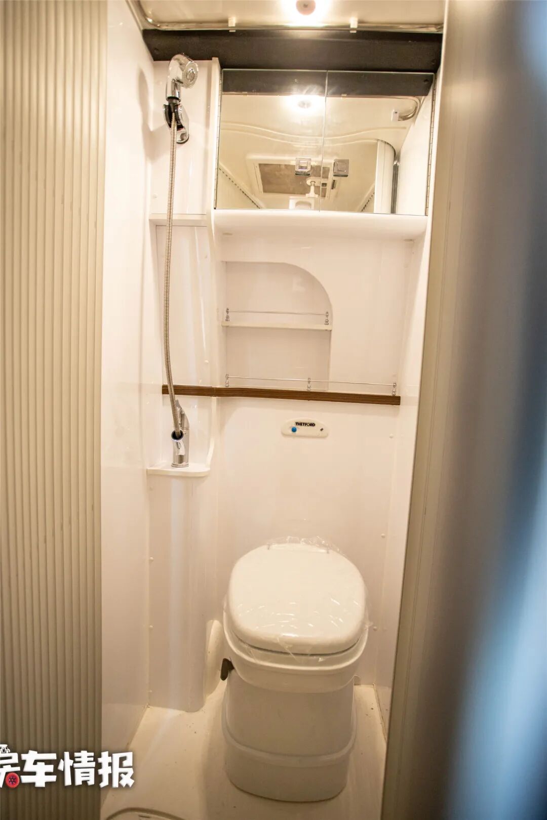 卫生间位于车厢中部,采用的是卷帘的形式,在使用的时候打开卷帘,就可以把车厢过道一同拓展到卫生间里,内部空间还是挺可观的。