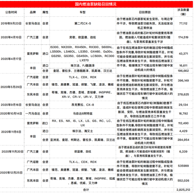 近年来,由于日本零部件巨头电装公司生产的燃油泵存在缺陷,已经致使多家日系车企发起大规模召回。在国内市场,包括广汽本田、东风本田、一汽丰田、广汽丰田、长安马自达、一汽马自达、广汽三菱等多家日系车企,均因为燃油泵缺陷而陷入召回门。