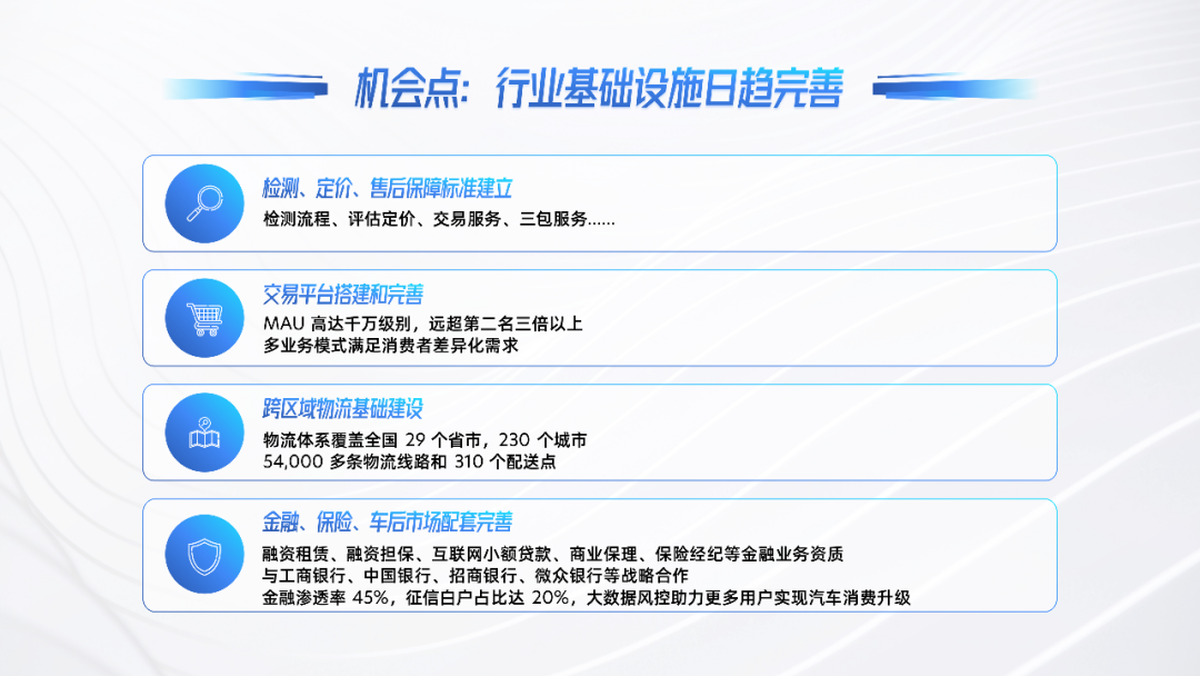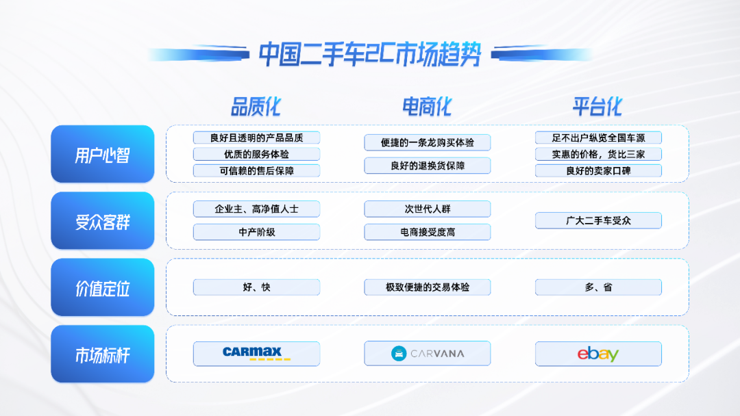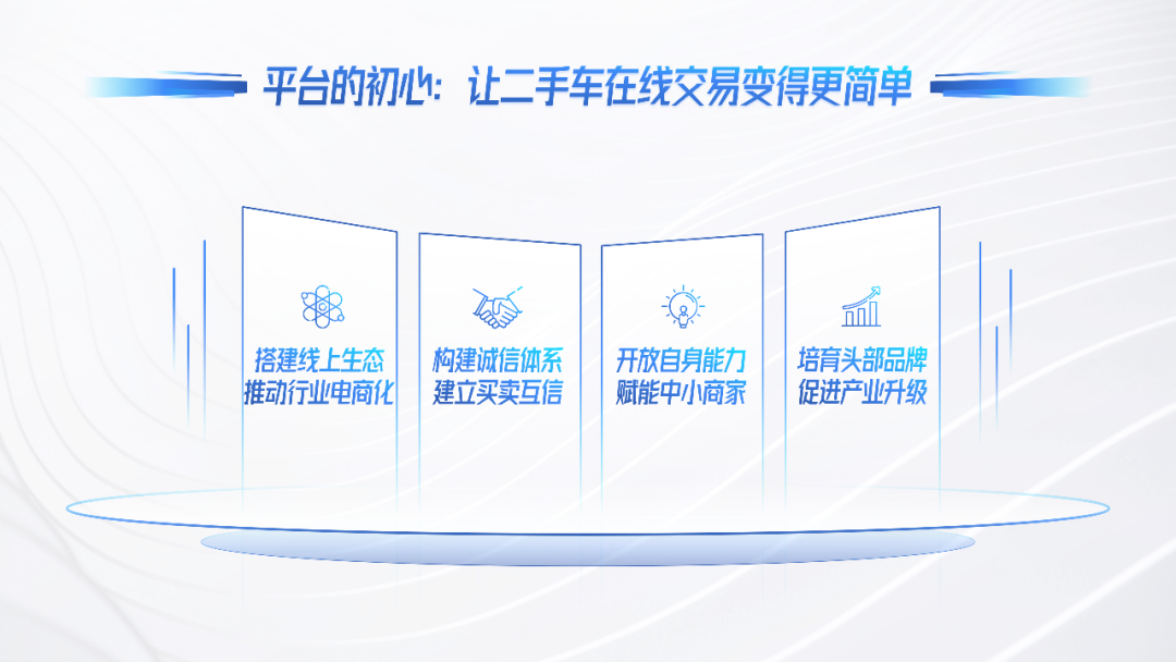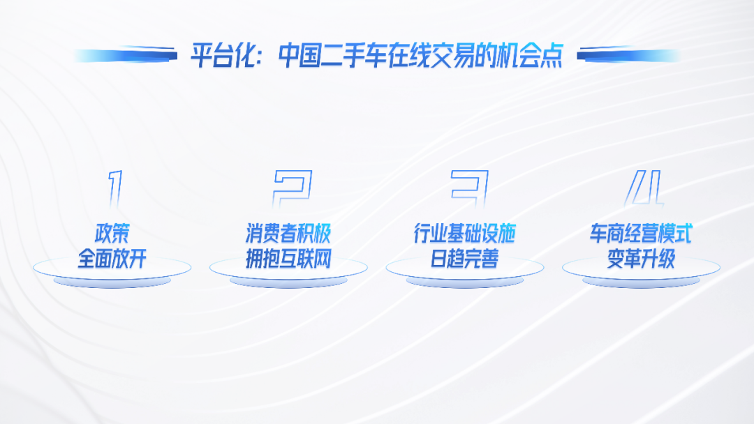 同时,我们发现当前的四个大的趋势,我们觉得在这些趋势下,平台化发展正在成为打开中国二手车在线交易市场的关键机会点。