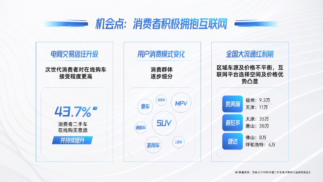之前我们看到的数据是,中国的二手车异地流通占比最高能达到28%,调研中有超过40%的用户有在线上平台上面直接进行消费的意愿。