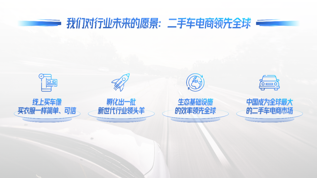 当然,我们对于整个行业的愿景,是希望在线买卖二手车的方式,跟京东淘宝购买一般的商品一样简单,也是希望通过行业协作实现更多的技术和能力创新,并持续赋能给商户,为商户和用户以及全行业实现收益和体验的升级。