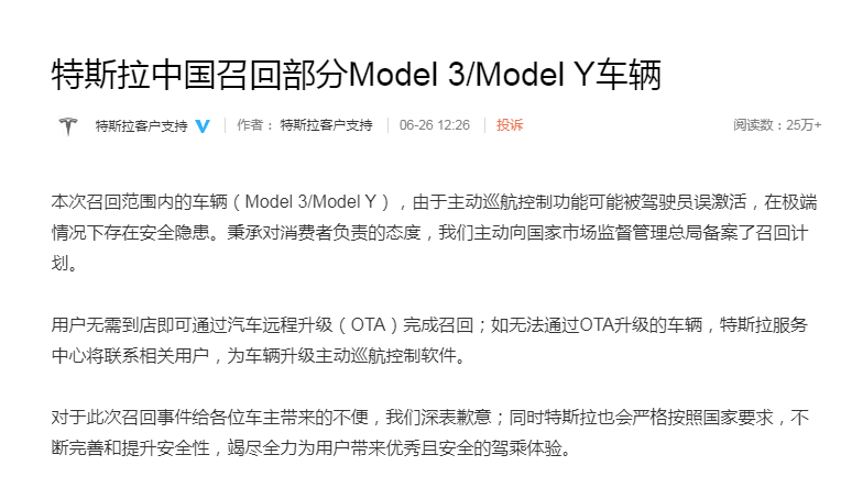 特斯拉表示,“对于此次召回事件给各位车主带来的不便,我们深表歉意。”