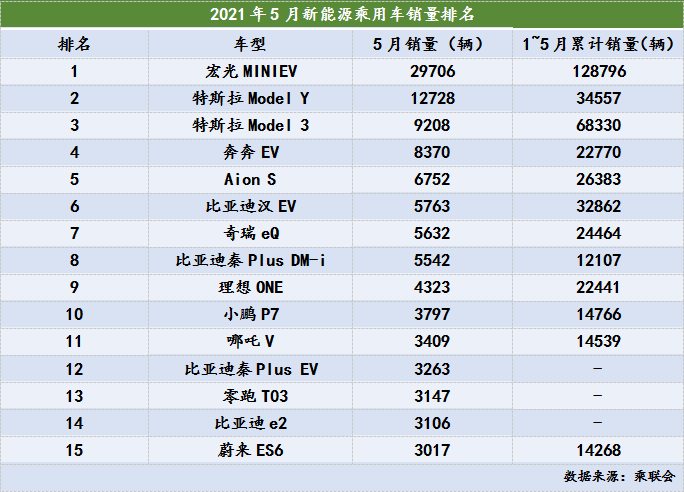 分品牌来看,5月国内新能源乘用车市场多元化发力,共有4家企业零售销量破万。其中,上汽通用五菱以3.32万辆的成绩,连续十个月坐稳中国新能源汽车月度销量榜首之位;比亚迪则以单月3.19万辆的销售成绩成功超越特斯拉位列第二;特斯拉中国则完成2.19万辆销量,下滑至第三;第四名广汽埃安销量为1.04万辆,与前三名仍存在不小差距。