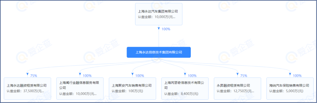 根据工商查询信息,上海永达信息技术集团有限公司作为上海永达汽车集团有限公司的全资子公司,是上海永达融资租赁有限公司、永昇融资租赁有限公司两家融资租赁公司以及海纳汽车保险销售公司的控股股东,可以说,上海永达信息技术集团有限公司是永达汽车金融板块的母公司。