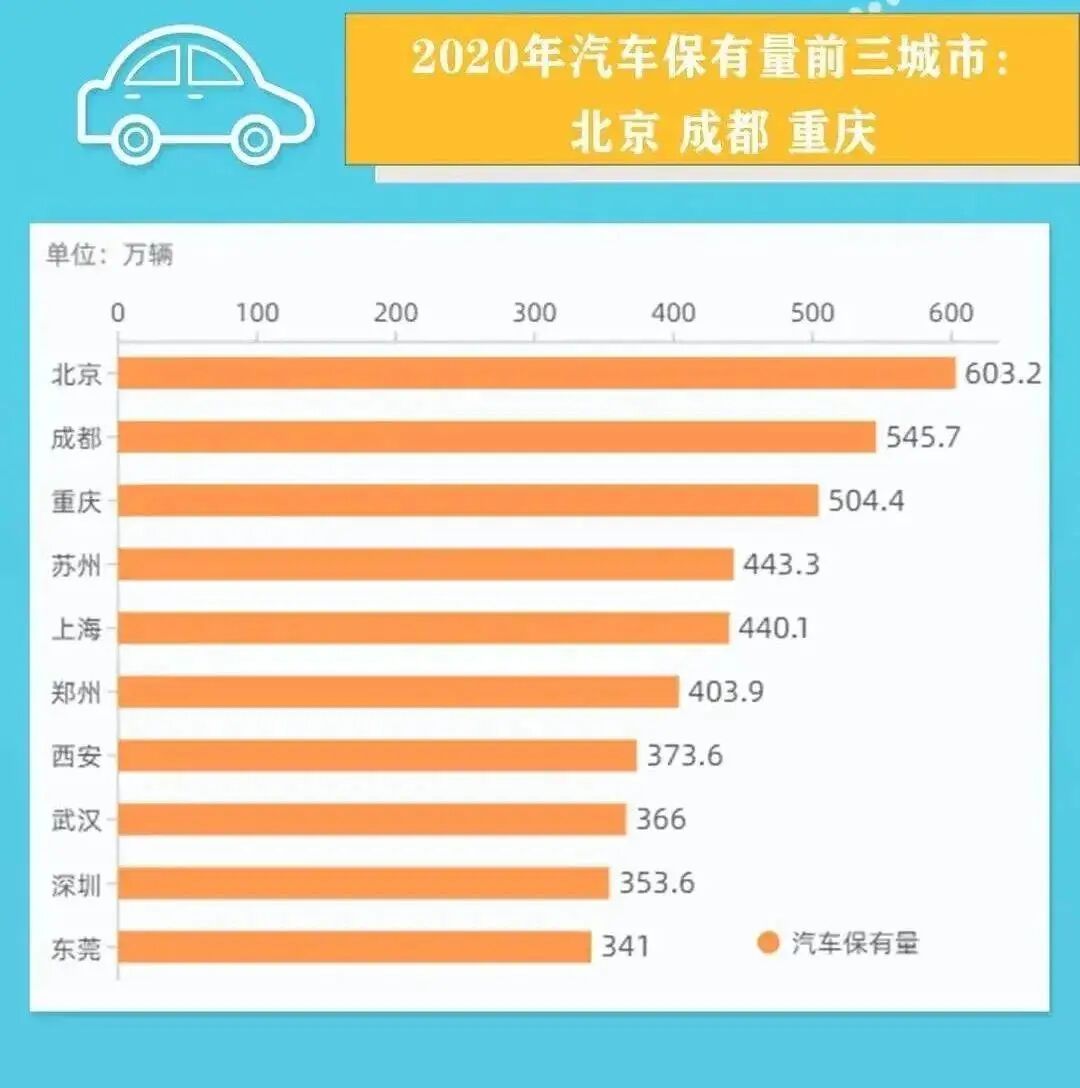 其中,北京汽车保有量超过600万辆,成都、重庆汽车保有量超过500万辆。苏州、上海、郑州汽车保有量超过400万辆。