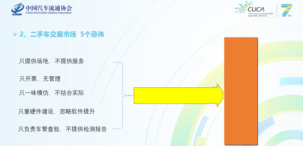 第三一味模仿,不结合实际。第四只注重硬件建设,不注重软件建设,楼盖的很漂亮,管理跟不上,服务跟不上。第五我们每个车都有查验,要满足公安的查验,但是入场车的检验,我们对消费者公开信息的数据没有,不提供检测报告,这也是短板。