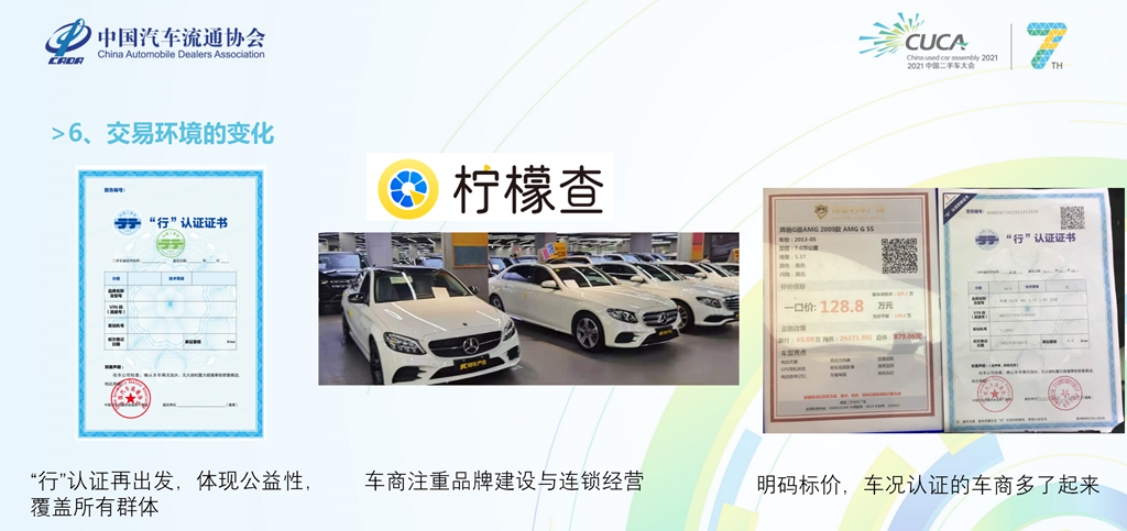 在去年我们协会又推了一个产品,叫“柠檬查”,不是喝的那个,是查询车辆的保险记录。我在好多地方还看到,我们很多的车商朋友自觉的公示车况、自觉的做明码标价。我想未来这个行业生态就向透明化、方向化方向发展。