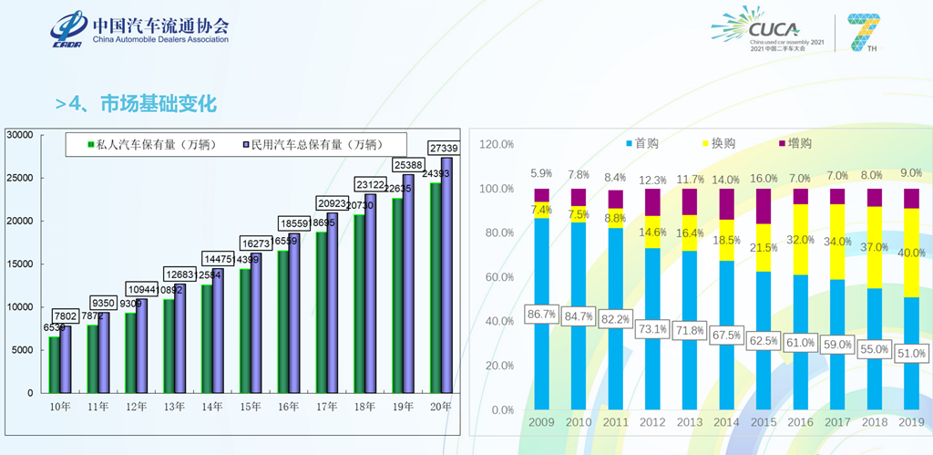 右侧图是近些年我们消费者在买新车的时候如何实现,中间黄色的柱子是通过置换来实现的购买新车。2019年达到了40%,2020年是多少呢?我看到一个数是46%,我不知道准不准,未来很多消费者在买车的时候不仅仅是单纯买一辆新车,有相当数量的是由二手车置换来驱动新车的销售。