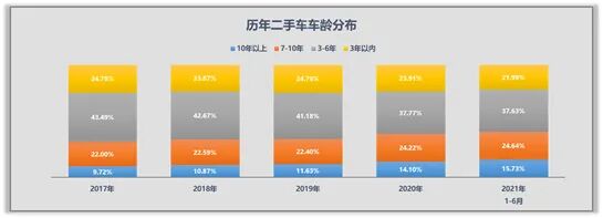从车龄分布状况看,2021年上半年车龄在3年以内的车型交易了185.49万辆,占总交易量的21.99%,较去年同期下降了1.80个百分点。