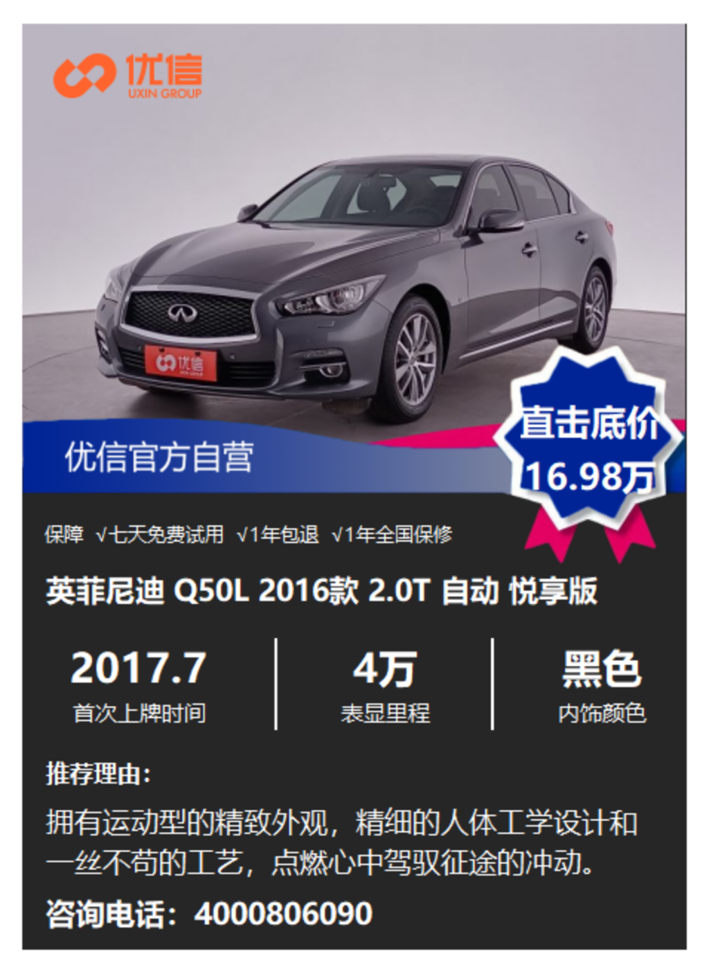 优信推荐的这款车,年份、配置、里程都没得说,只可惜“耗子皮”的颜色差点意思,16.98万小贵了,建议优惠3000再考虑,要是黑色,最好!