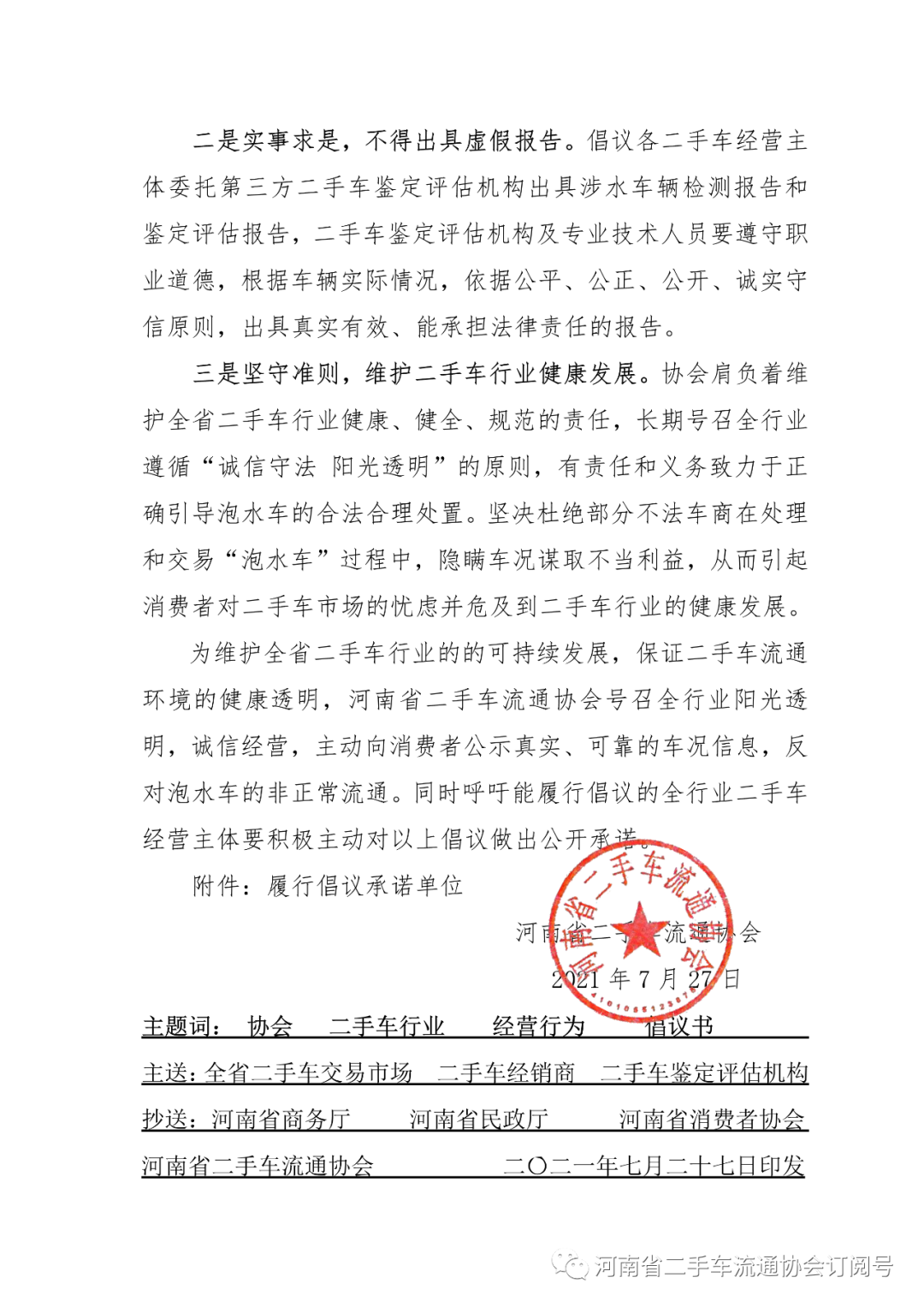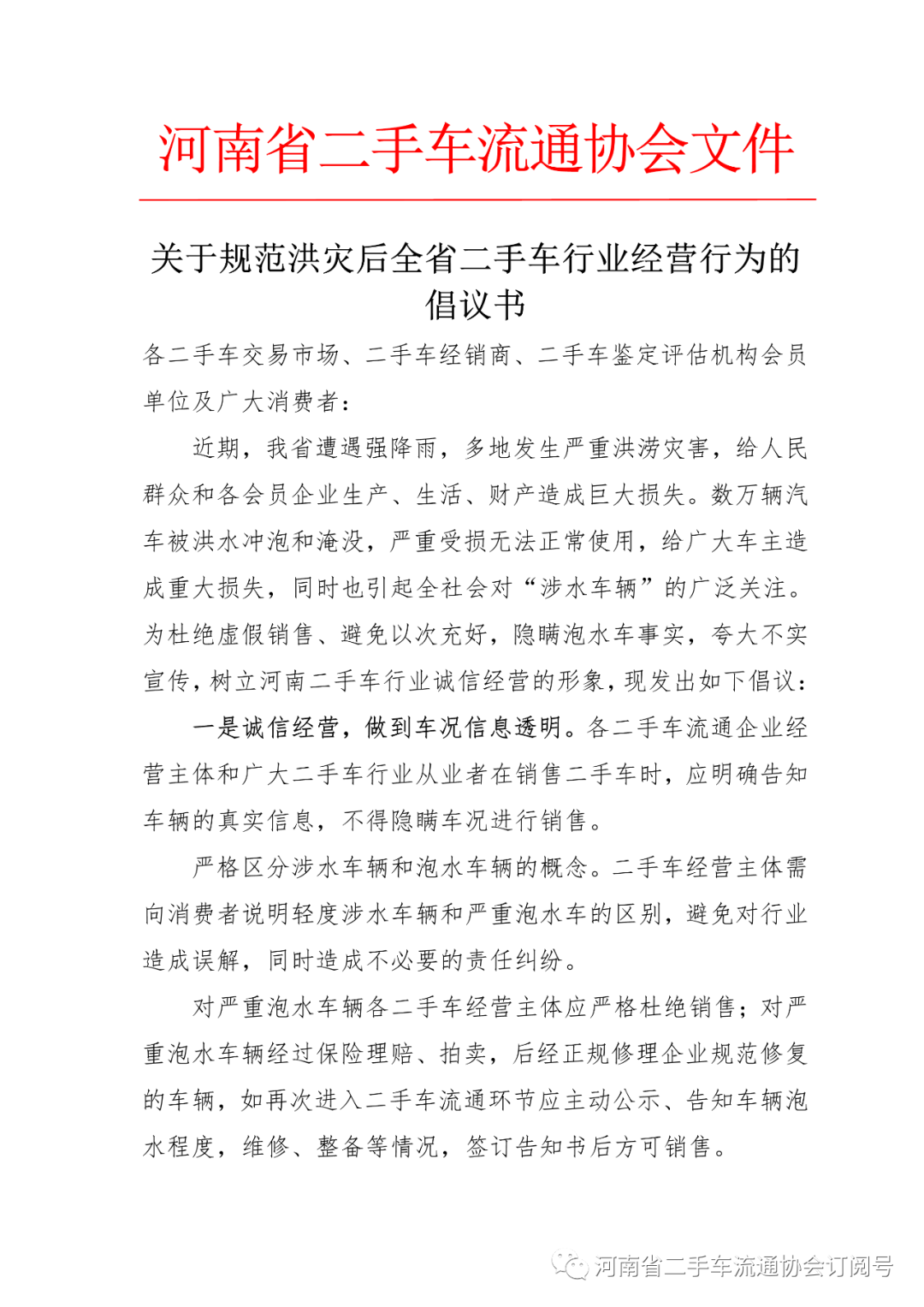 为维护全省二手车行业的的可持续发展,保证二手车流通环境的健康透明,河南省二手车流通协会号召全行业阳光透明,诚信经营,主动向消费者公示真实,可靠的车况信息,反对泡水车的非正常流通。同时呼吁能履行倡议的全行业二手车。