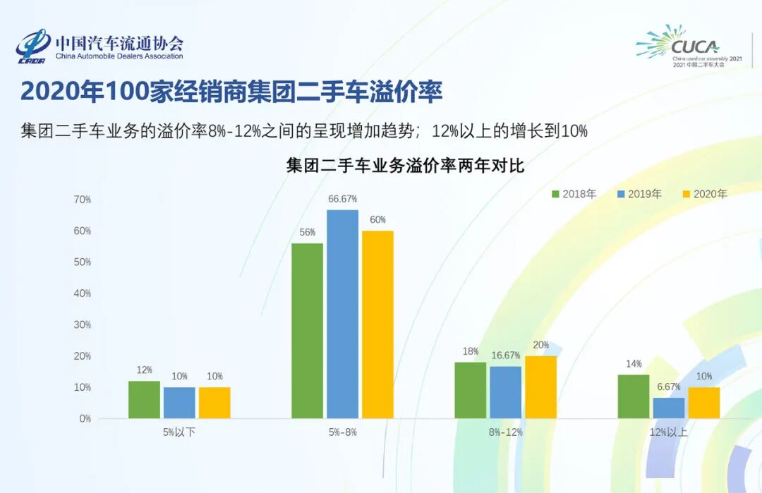 从100家经销商集团二手车溢价率来看,100家经销商集团二手车溢价率在8%~12%之间的呈现增加趋势,12%以上的增长到10%。