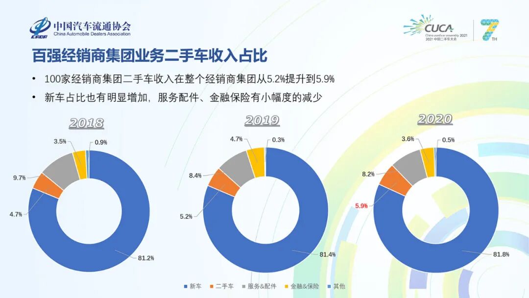 在业务占比方面,2020年中国100家经销商集团二手车业务占整体比例变化并不是很大,但是二手车业务收入占整个经销商比例为5.9%,比2019年增长了0.7%,其中新车业务也上涨了0.4%,但是服务配件、金融业务相比上年有小幅度的下降。